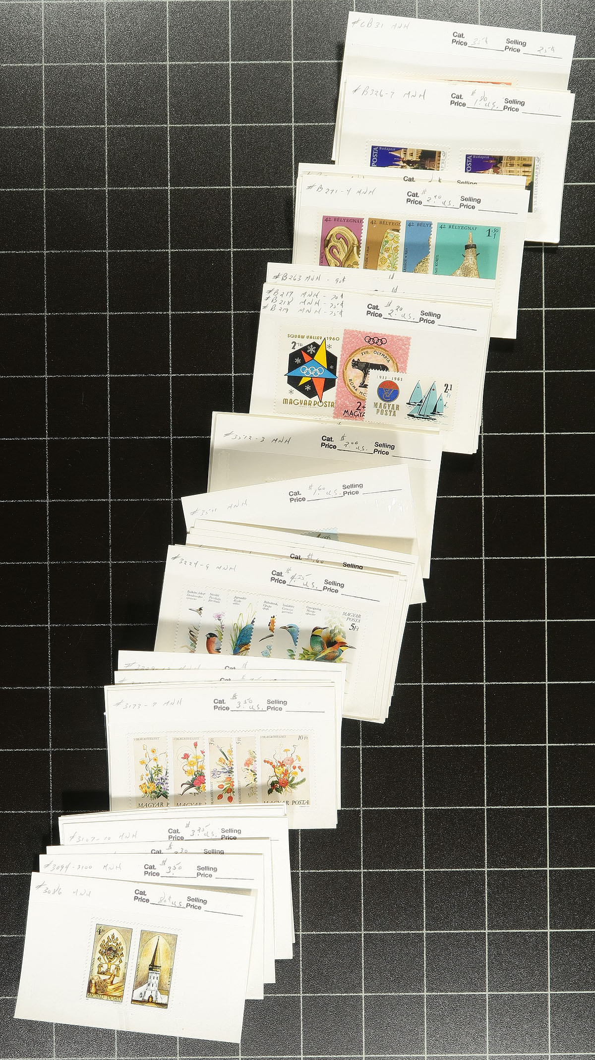 Well organized group of never hinged Hungary singles and sets, 1950's-1990's, all well identified in 102 cards with older catalogue values. We note roughly 175 different sets ranging from Scott #1043/3514, along with semi-postals from #B207/B358a. A nice clean lot for collectors and dealers alike, noting several topical and thematic possibilities. Very fine. 2026 Scott US$459.00 =