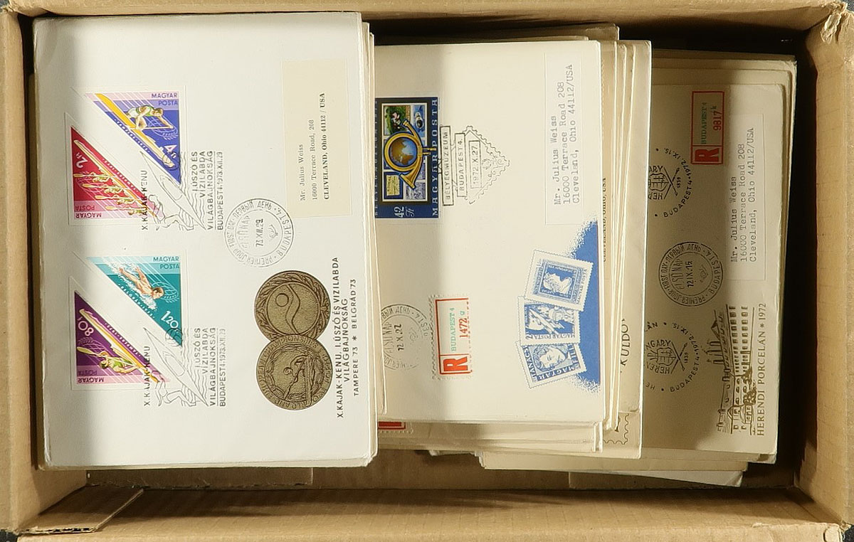 Group of 150 Hungary first day covers all with imperforate frankings, 1962-1979. We note singles, sets, and partial set frankings, almost all registered first day covers to the United States, with some covers having perforated stamps on the back. Scott 2026 catalogue value for the lot totals US$858.00 (cataloguing imperforates only for used values), noting some sets cataloguing $10 to $15 and up each. A nice lot, with some covers having corner faults, still a most interesting lot for the Hungary or worldwide cover collector. Estimate =