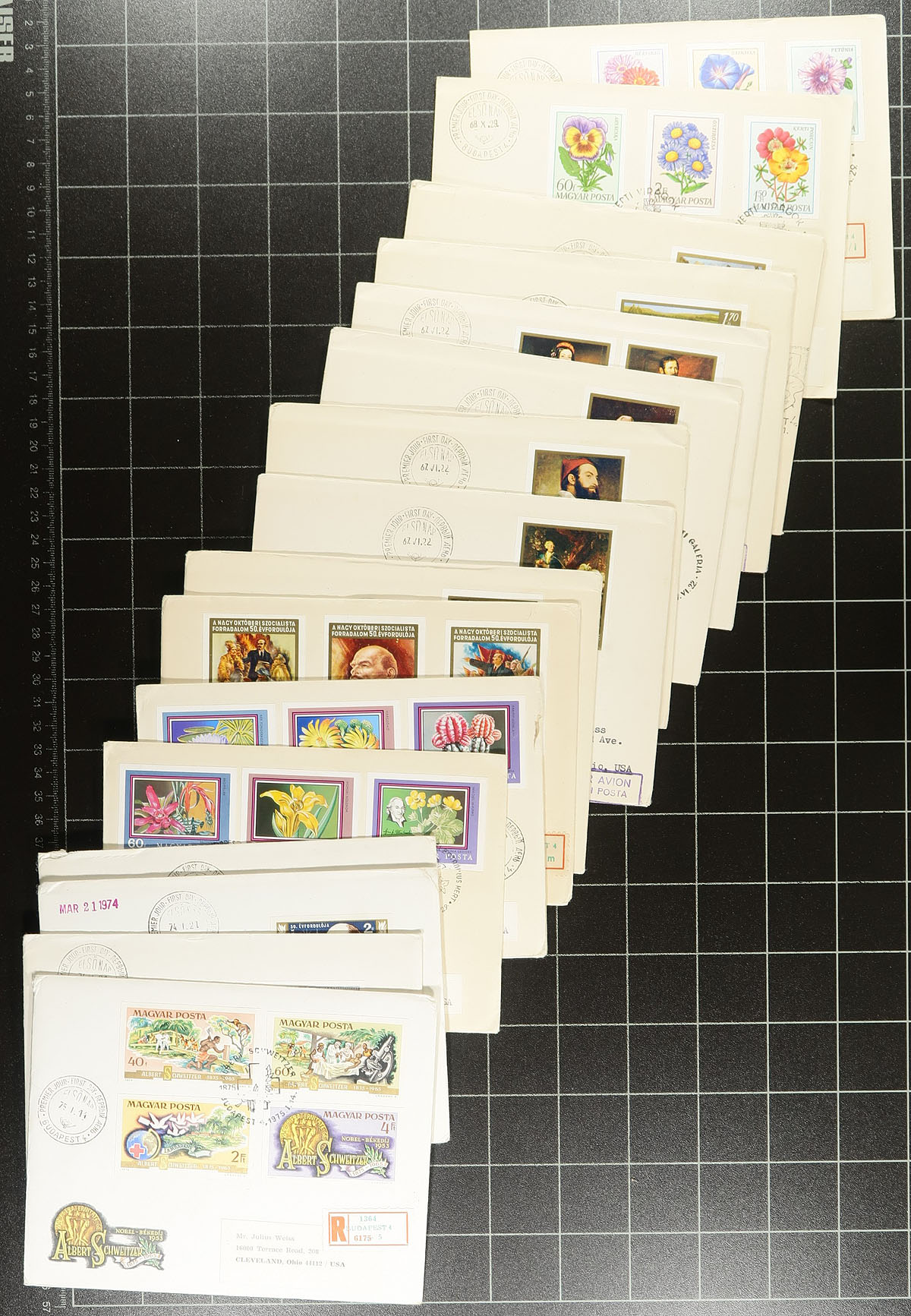 Group of 150 Hungary first day covers all with imperforate frankings, 1962-1979. We note singles, sets, and partial set frankings, almost all registered first day covers to the United States, with some covers having perforated stamps on the back. Scott 2026 catalogue value for the lot totals US$858.00 (cataloguing imperforates only for used values), noting some sets cataloguing $10 to $15 and up each. A nice lot, with some covers having corner faults, still a most interesting lot for the Hungary or worldwide cover collector. Estimate =