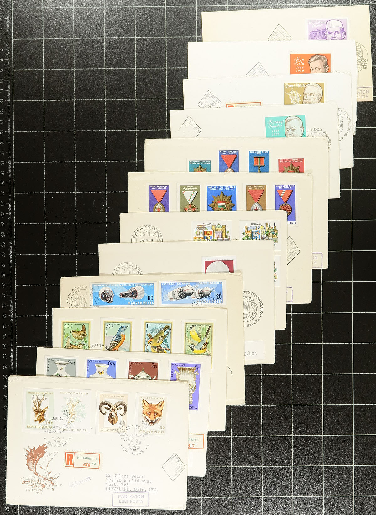 Group of 150 Hungary first day covers all with imperforate frankings, 1962-1979. We note singles, sets, and partial set frankings, almost all registered first day covers to the United States, with some covers having perforated stamps on the back. Scott 2026 catalogue value for the lot totals US$858.00 (cataloguing imperforates only for used values), noting some sets cataloguing $10 to $15 and up each. A nice lot, with some covers having corner faults, still a most interesting lot for the Hungary or worldwide cover collector. Estimate =