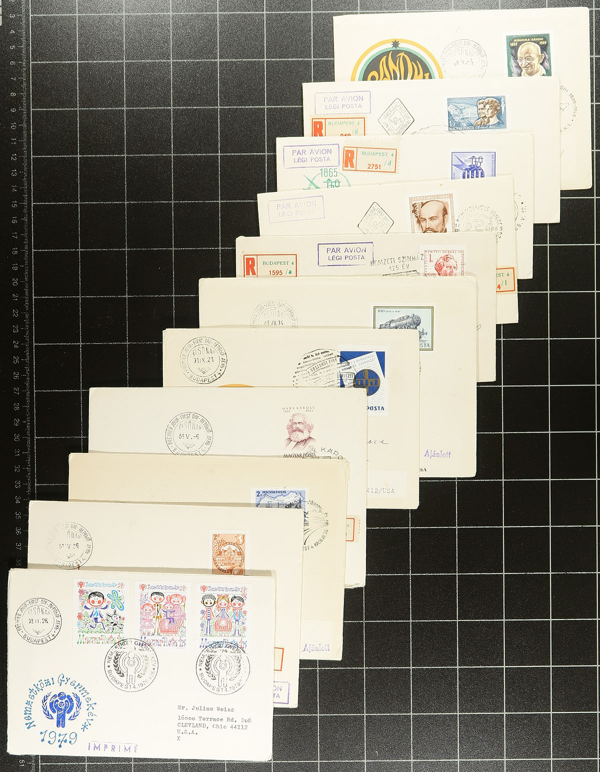 Group of 150 Hungary first day covers all with imperforate frankings, 1962-1979. We note singles, sets, and partial set frankings, almost all registered first day covers to the United States, with some covers having perforated stamps on the back. Scott 2026 catalogue value for the lot totals US$858.00 (cataloguing imperforates only for used values), noting some sets cataloguing $10 to $15 and up each. A nice lot, with some covers having corner faults, still a most interesting lot for the Hungary or worldwide cover collector. Estimate =
