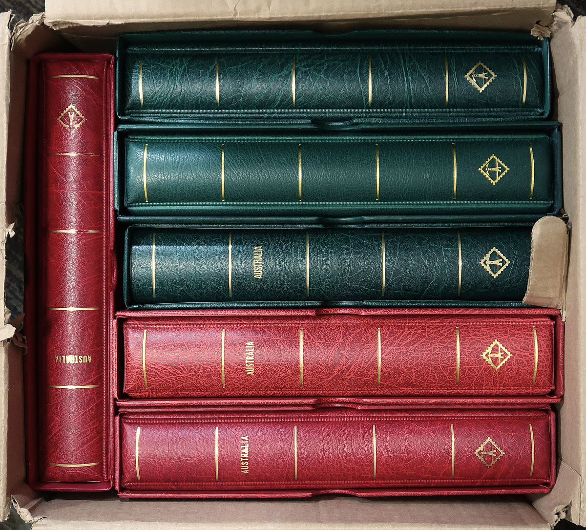 Lovely group of 6 Lighthouse 2-post albums with slipcases. Three each of green and red, with 4 of the albums labeled for Australia, but suitable for all worldwide collectors. The albums to appear to be brand new or in like new condition. Retail value for each album is roughly $150.00 each, making this an ideal lot for all collectors. Estimate =