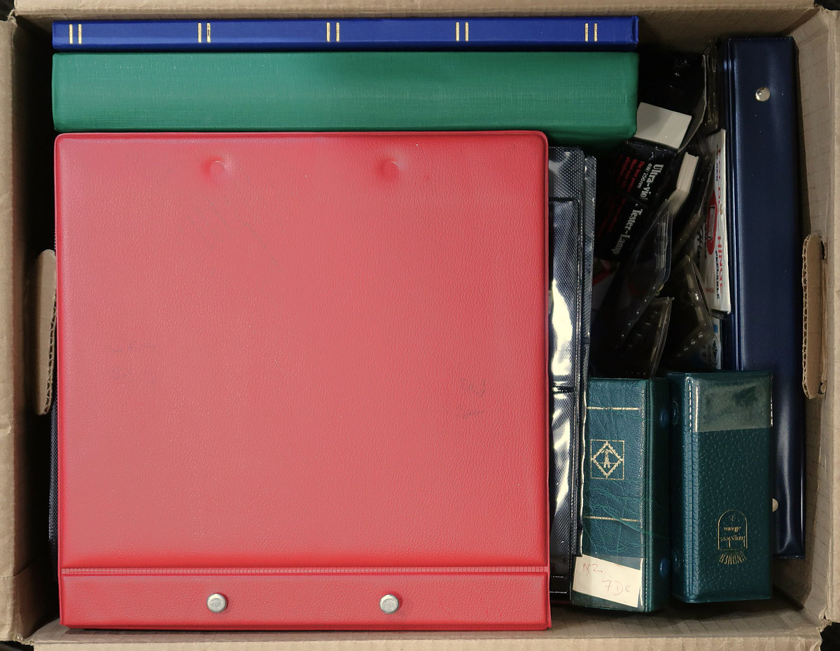 Carton full of used to gently used supplies, noting a couple of stockbooks, 4 cover albums, 2 binders with slipcases, stock pages (4 square pages suitable for plate blocks), red box with cover (roughly 400x 102 cards inside, almost all with some pencil notations), and other odds and ends. Sill useful for the new owner. Estimate =