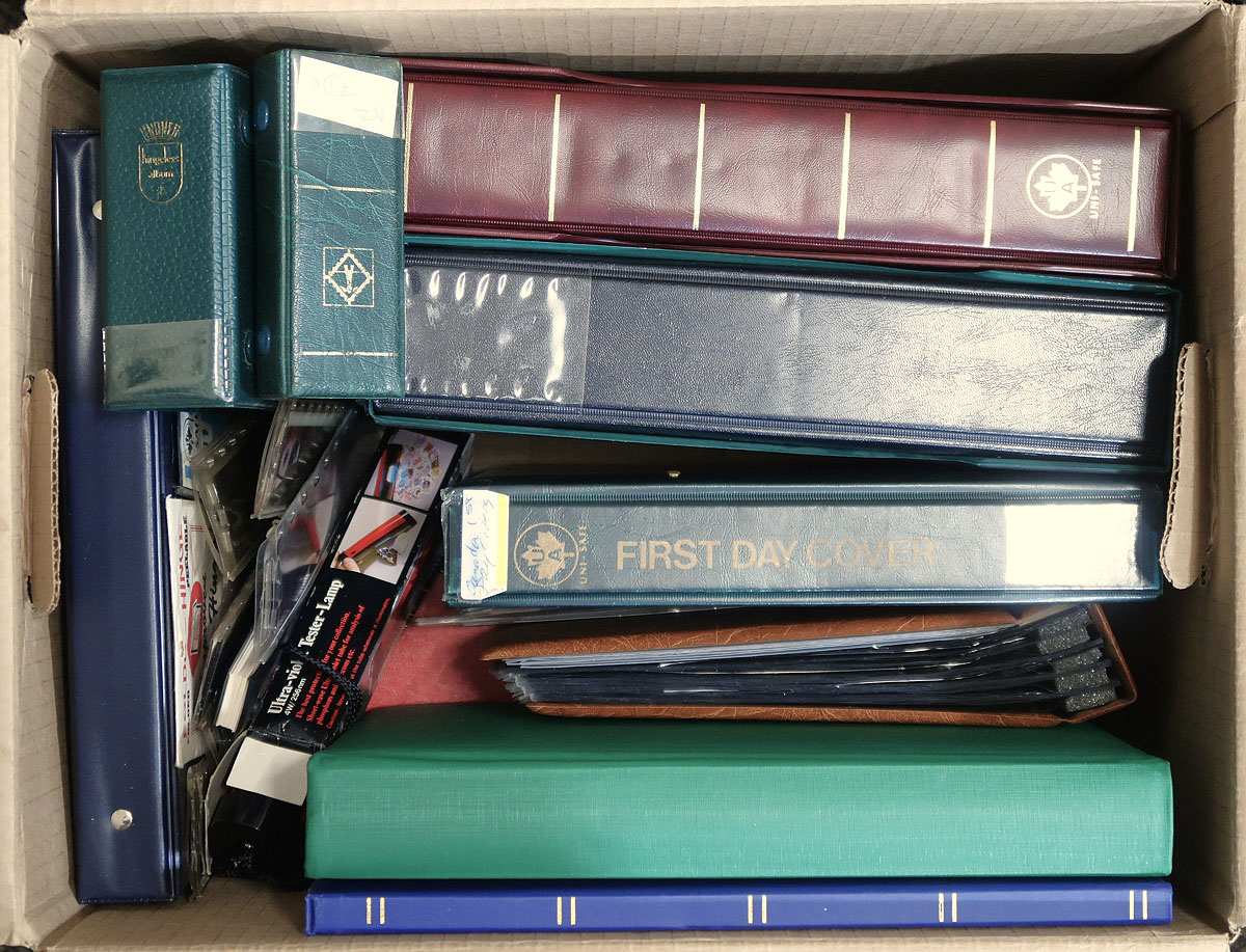 Carton full of used to gently used supplies, noting a couple of stockbooks, 4 cover albums, 2 binders with slipcases, stock pages (4 square pages suitable for plate blocks), red box with cover (roughly 400x 102 cards inside, almost all with some pencil notations), and other odds and ends. Sill useful for the new owner. Estimate =