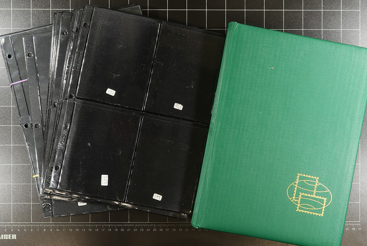 Carton full of used to gently used supplies, noting a couple of stockbooks, 4 cover albums, 2 binders with slipcases, stock pages (4 square pages suitable for plate blocks), red box with cover (roughly 400x 102 cards inside, almost all with some pencil notations), and other odds and ends. Sill useful for the new owner. Estimate =