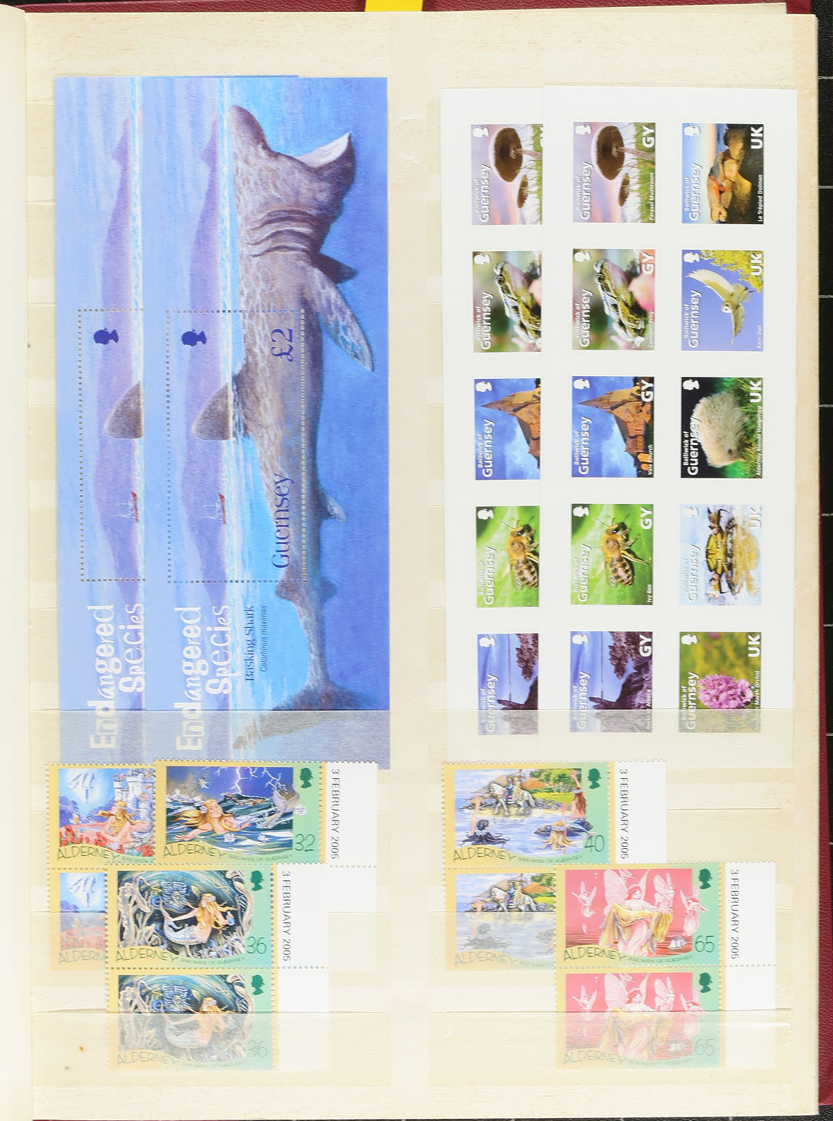 Lovely never hinged stock of Guernsey, Alderney, and Isle of Man, 1969-2014, containing roughly 2,500 stamps in two stockbooks. The lot is fairly organized noting Guernsey ranging from Scott #9/1246, Alderney #1/382, Isle of Man #105/649, containing several sets, souvenir sheets (roughly 90 in total), plate blocks, gutter blocks, back of the book issues, and more, with some slight duplication throughout. Face value alone is over £1,000.00, and a presumably high catalogue value. A very nice lot for collectors and dealers alike. Online photos show a small sampling. Very fine. Estimate =