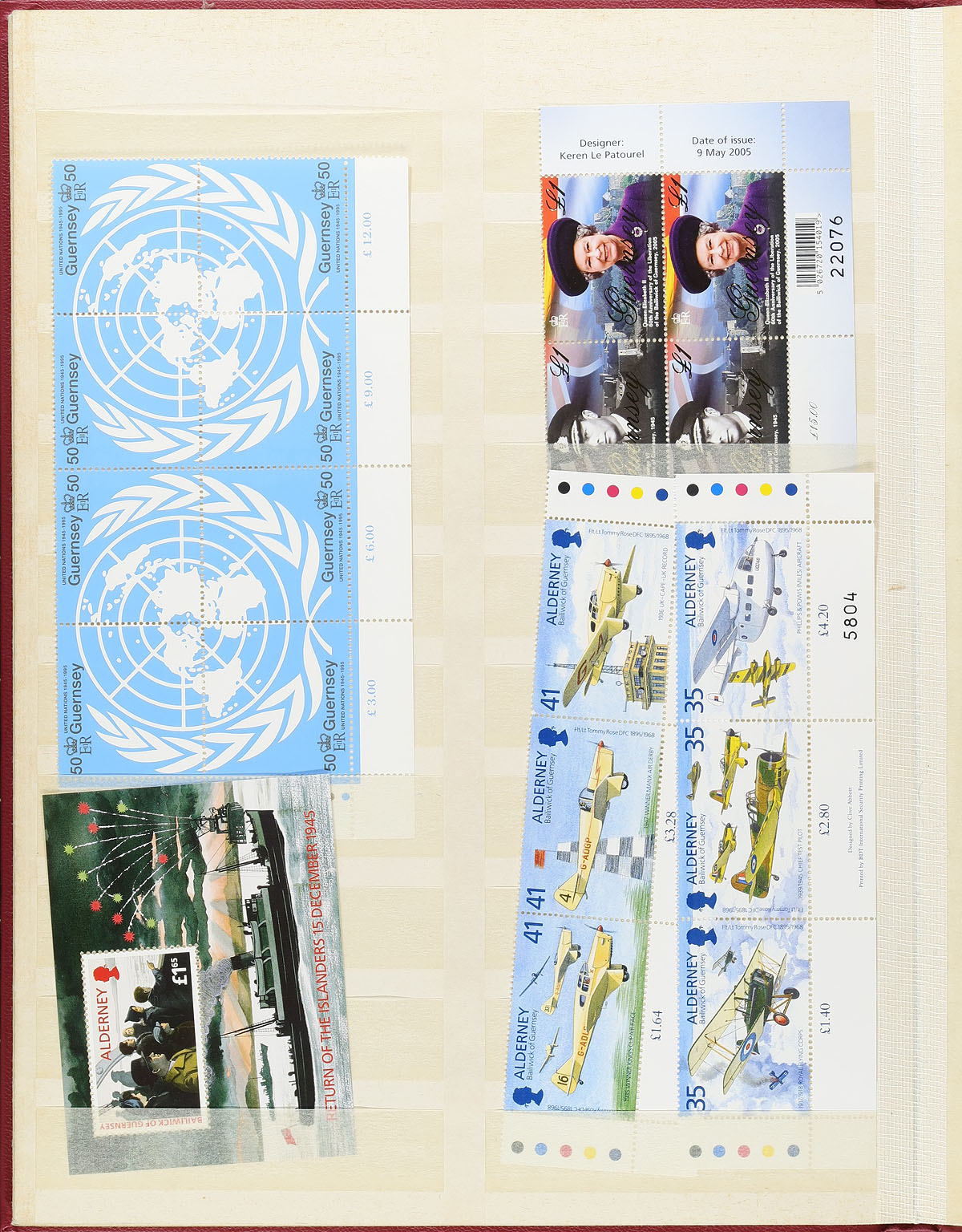 Lovely never hinged stock of Guernsey, Alderney, and Isle of Man, 1969-2014, containing roughly 2,500 stamps in two stockbooks. The lot is fairly organized noting Guernsey ranging from Scott #9/1246, Alderney #1/382, Isle of Man #105/649, containing several sets, souvenir sheets (roughly 90 in total), plate blocks, gutter blocks, back of the book issues, and more, with some slight duplication throughout. Face value alone is over £1,000.00, and a presumably high catalogue value. A very nice lot for collectors and dealers alike. Online photos show a small sampling. Very fine. Estimate =