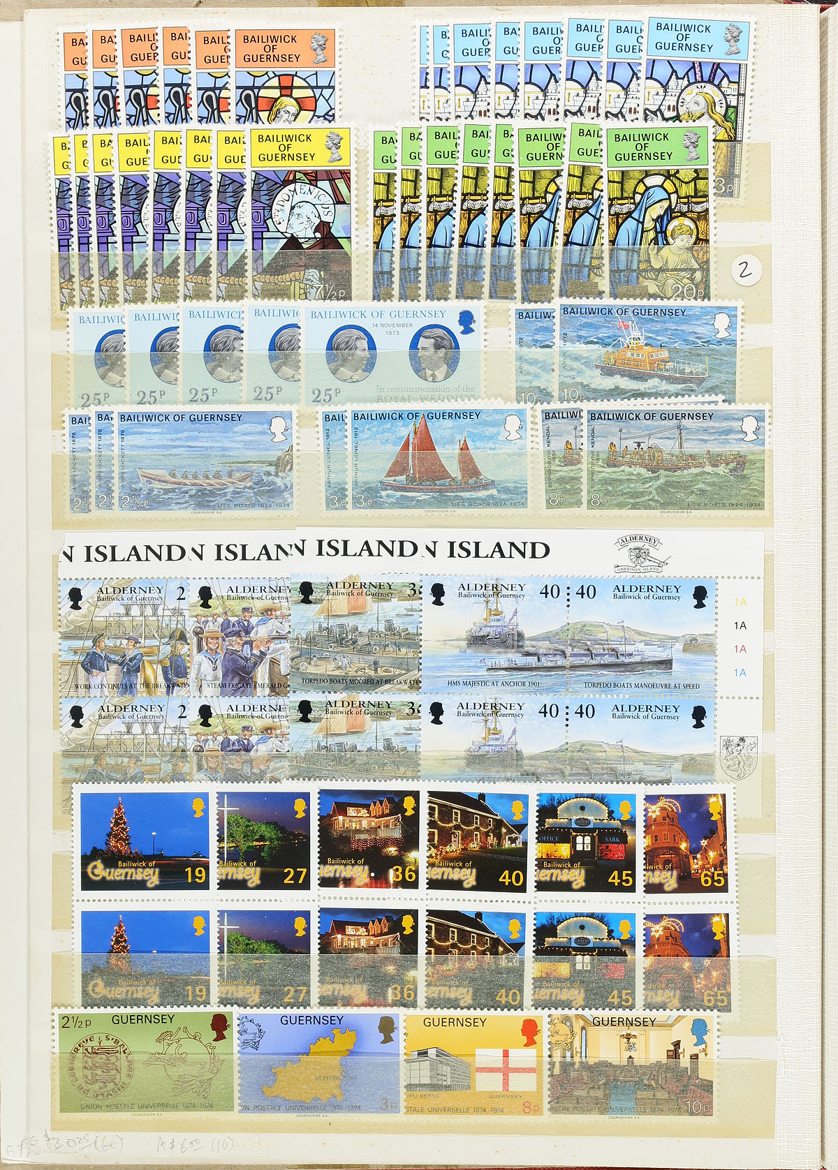Lovely never hinged stock of Guernsey, Alderney, and Isle of Man, 1969-2014, containing roughly 2,500 stamps in two stockbooks. The lot is fairly organized noting Guernsey ranging from Scott #9/1246, Alderney #1/382, Isle of Man #105/649, containing several sets, souvenir sheets (roughly 90 in total), plate blocks, gutter blocks, back of the book issues, and more, with some slight duplication throughout. Face value alone is over £1,000.00, and a presumably high catalogue value. A very nice lot for collectors and dealers alike. Online photos show a small sampling. Very fine. Estimate =