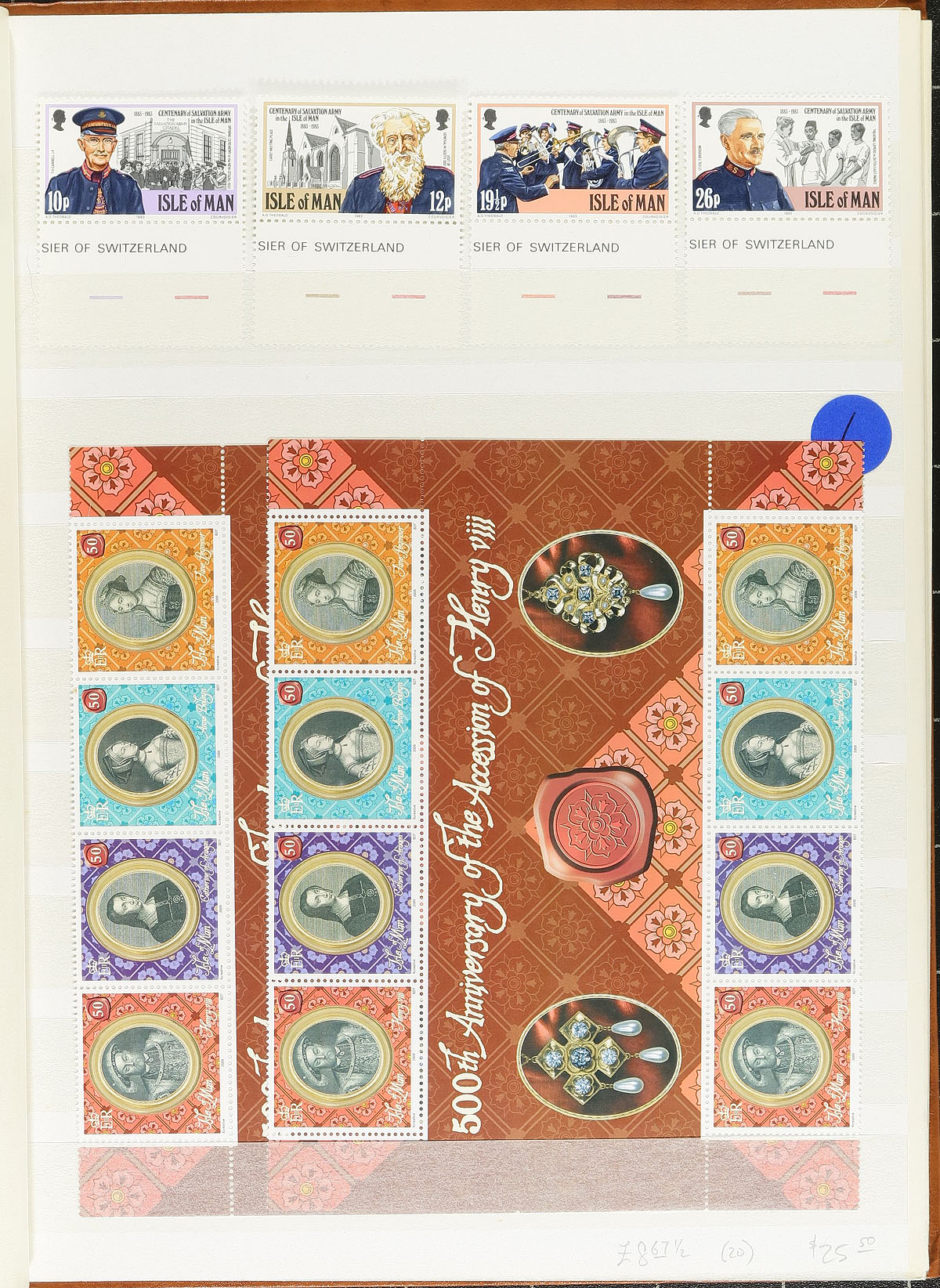 Clean stock of never hinged Isle of Man, 1974-2009, containing many hundreds of stamps in a stockbook. This neatly organized lot ranges from Scott #51a/1302, containing sets, and well over 100 souvenir sheets, gutter blocks, and back of the book issues. A spot check indicated material cataloguing $5 to $10 each, with owner's Scott 2019 catalogue value for the lot totaling US$733.00, face value alone is £170.00. Duplication generally ranges from 3 to 5 and up for some issues. A nice lot for collectors and dealers alike. Estimate =