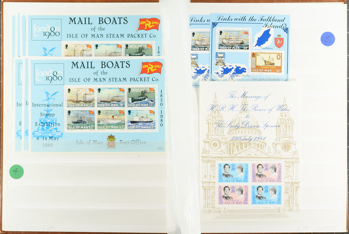 Clean stock of never hinged Isle of Man, 1974-2009, containing many hundreds of stamps in a stockbook. This neatly organized lot ranges from Scott #51a/1302, containing sets, and well over 100 souvenir sheets, gutter blocks, and back of the book issues. A spot check indicated material cataloguing $5 to $10 each, with owner's Scott 2019 catalogue value for the lot totaling US$733.00, face value alone is £170.00. Duplication generally ranges from 3 to 5 and up for some issues. A nice lot for collectors and dealers alike. Estimate =