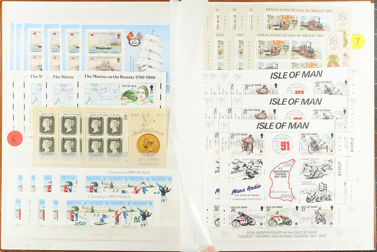 Clean stock of never hinged Isle of Man, 1974-2009, containing many hundreds of stamps in a stockbook. This neatly organized lot ranges from Scott #51a/1302, containing sets, and well over 100 souvenir sheets, gutter blocks, and back of the book issues. A spot check indicated material cataloguing $5 to $10 each, with owner's Scott 2019 catalogue value for the lot totaling US$733.00, face value alone is £170.00. Duplication generally ranges from 3 to 5 and up for some issues. A nice lot for collectors and dealers alike. Estimate =