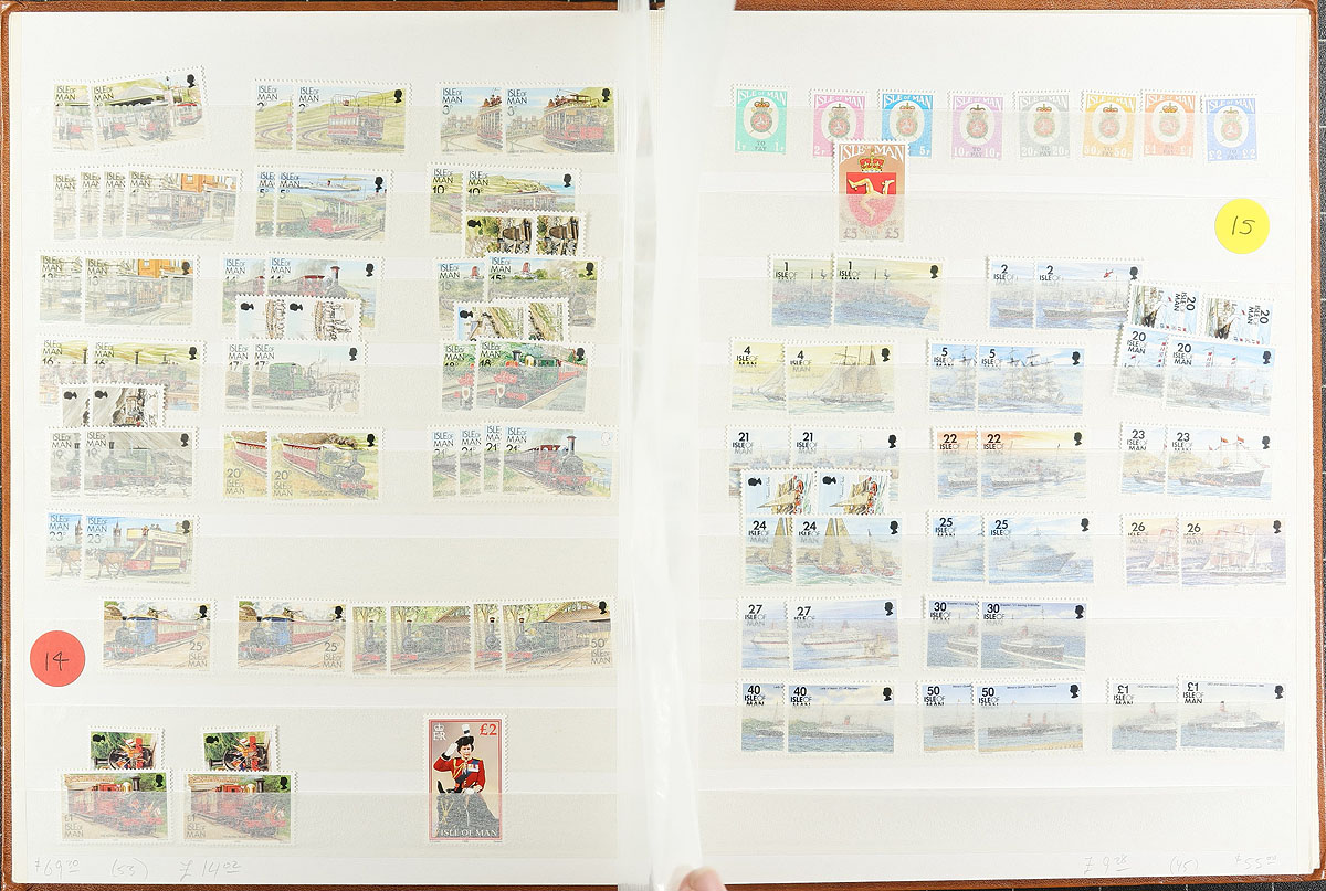 Clean stock of never hinged Isle of Man, 1974-2009, containing many hundreds of stamps in a stockbook. This neatly organized lot ranges from Scott #51a/1302, containing sets, and well over 100 souvenir sheets, gutter blocks, and back of the book issues. A spot check indicated material cataloguing $5 to $10 each, with owner's Scott 2019 catalogue value for the lot totaling US$733.00, face value alone is £170.00. Duplication generally ranges from 3 to 5 and up for some issues. A nice lot for collectors and dealers alike. Estimate =