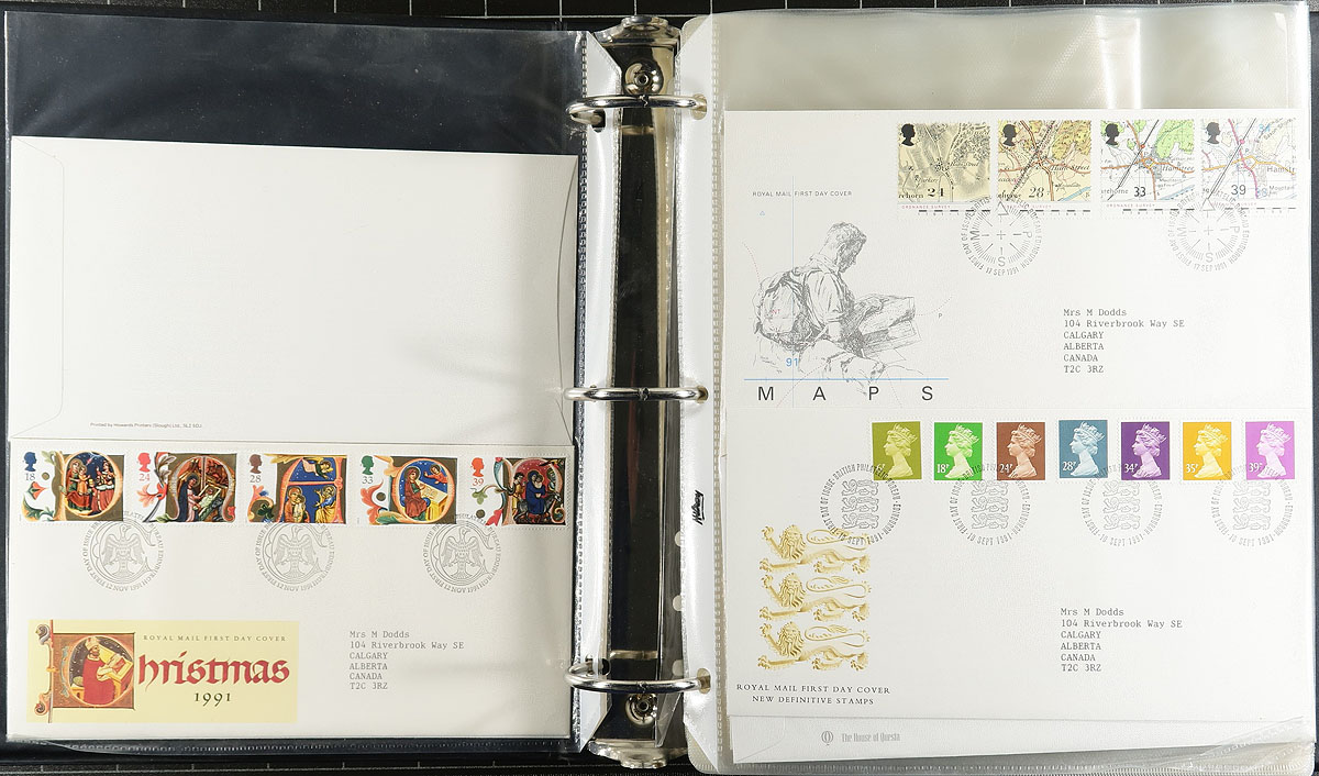 Nice group of roughly 325 first day covers, 1978-2008, in 2 binders with roughly 200 loose covers. We note primarily set frankings, along with souvenir sheets, Machin (including Regionals), and high denomination frankings, with the majority of material post 1996. Concise catalogue value for the lot would be worth several hundred pounds, making this a nice lot for collectors and dealers alike. A few corner bends on a few covers, still a very fine lot. Estimate =