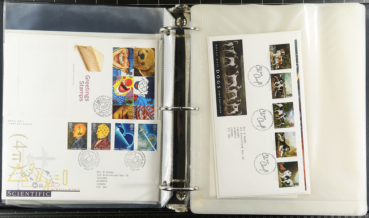 Nice group of roughly 325 first day covers, 1978-2008, in 2 binders with roughly 200 loose covers. We note primarily set frankings, along with souvenir sheets, Machin (including Regionals), and high denomination frankings, with the majority of material post 1996. Concise catalogue value for the lot would be worth several hundred pounds, making this a nice lot for collectors and dealers alike. A few corner bends on a few covers, still a very fine lot. Estimate =