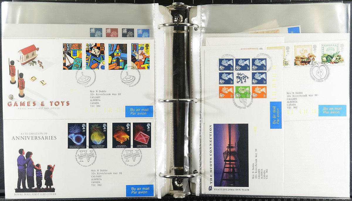 Nice group of roughly 325 first day covers, 1978-2008, in 2 binders with roughly 200 loose covers. We note primarily set frankings, along with souvenir sheets, Machin (including Regionals), and high denomination frankings, with the majority of material post 1996. Concise catalogue value for the lot would be worth several hundred pounds, making this a nice lot for collectors and dealers alike. A few corner bends on a few covers, still a very fine lot. Estimate =