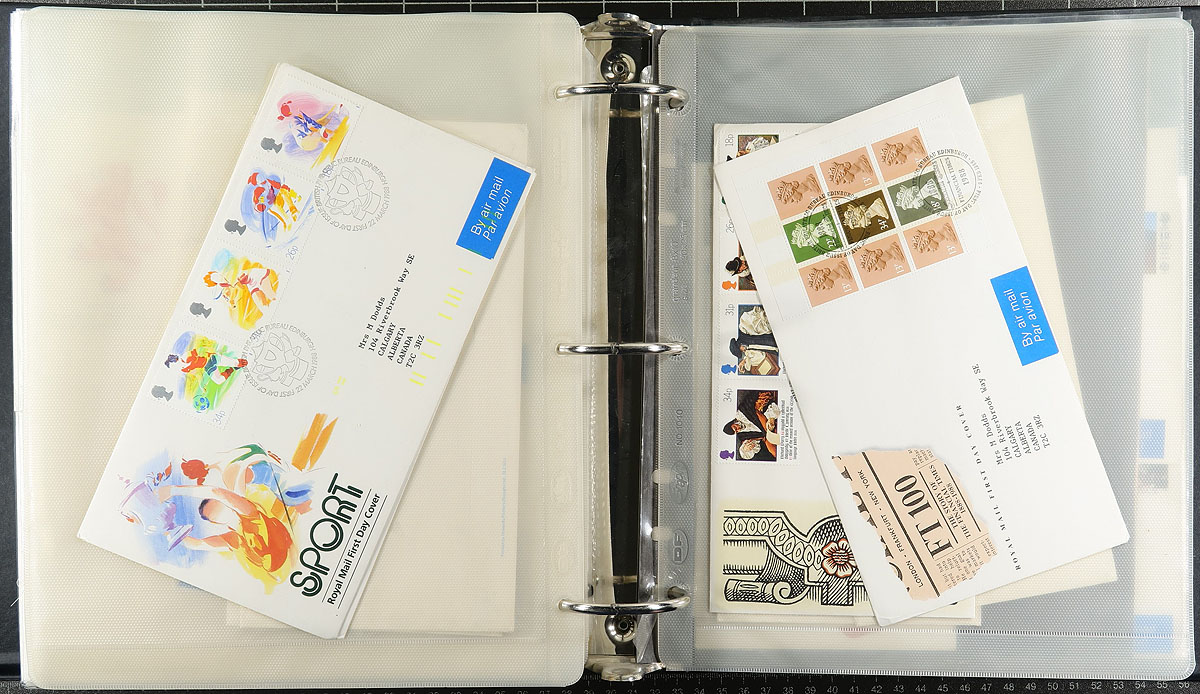 Nice group of roughly 325 first day covers, 1978-2008, in 2 binders with roughly 200 loose covers. We note primarily set frankings, along with souvenir sheets, Machin (including Regionals), and high denomination frankings, with the majority of material post 1996. Concise catalogue value for the lot would be worth several hundred pounds, making this a nice lot for collectors and dealers alike. A few corner bends on a few covers, still a very fine lot. Estimate =