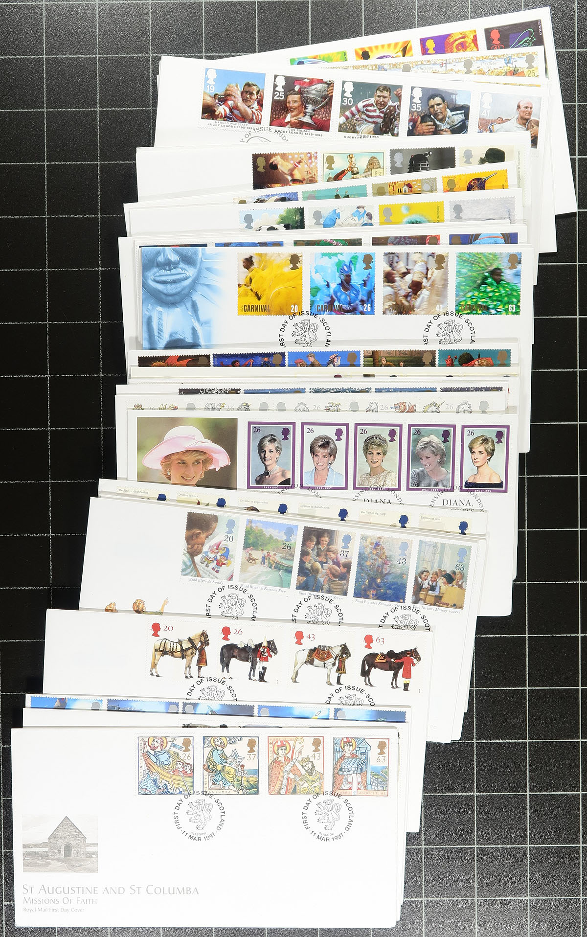 Nice group of roughly 325 first day covers, 1978-2008, in 2 binders with roughly 200 loose covers. We note primarily set frankings, along with souvenir sheets, Machin (including Regionals), and high denomination frankings, with the majority of material post 1996. Concise catalogue value for the lot would be worth several hundred pounds, making this a nice lot for collectors and dealers alike. A few corner bends on a few covers, still a very fine lot. Estimate =
