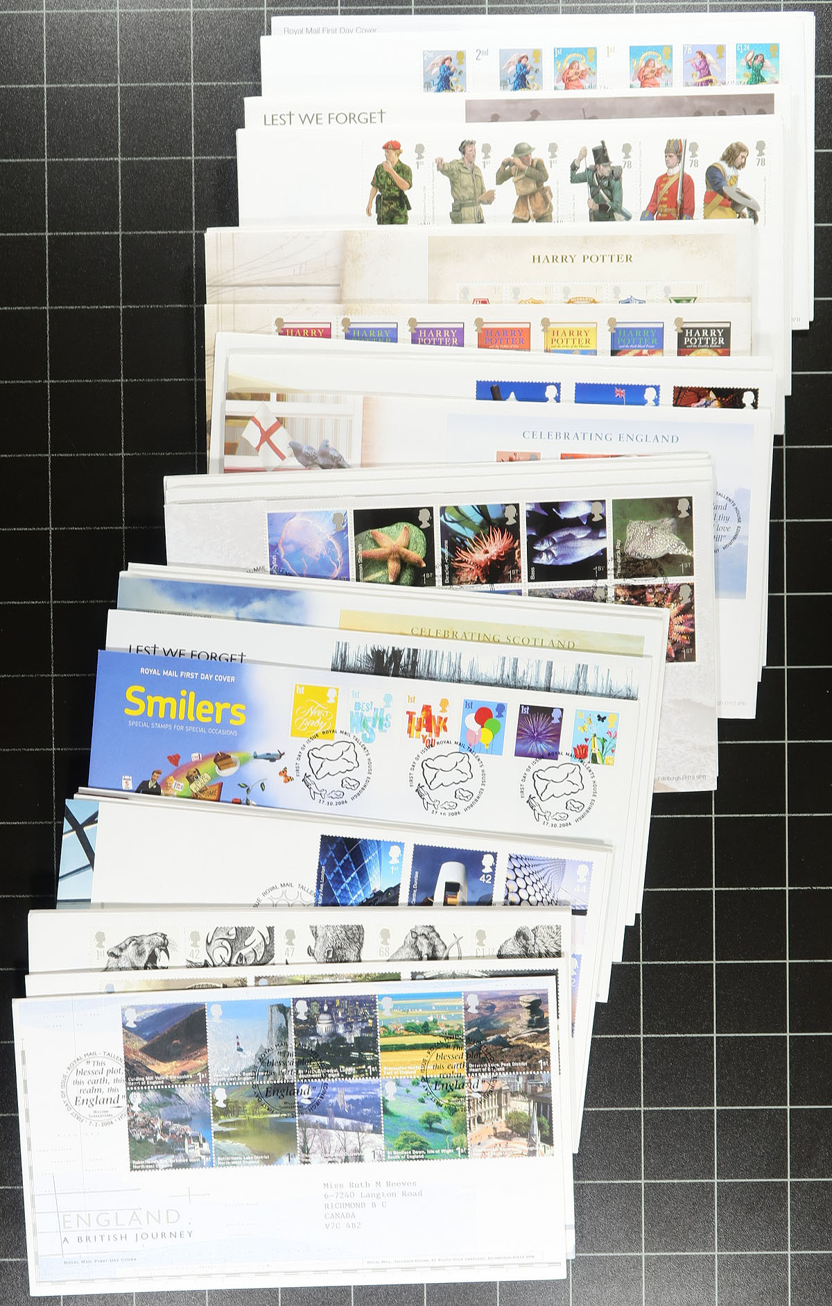 Nice group of roughly 325 first day covers, 1978-2008, in 2 binders with roughly 200 loose covers. We note primarily set frankings, along with souvenir sheets, Machin (including Regionals), and high denomination frankings, with the majority of material post 1996. Concise catalogue value for the lot would be worth several hundred pounds, making this a nice lot for collectors and dealers alike. A few corner bends on a few covers, still a very fine lot. Estimate =