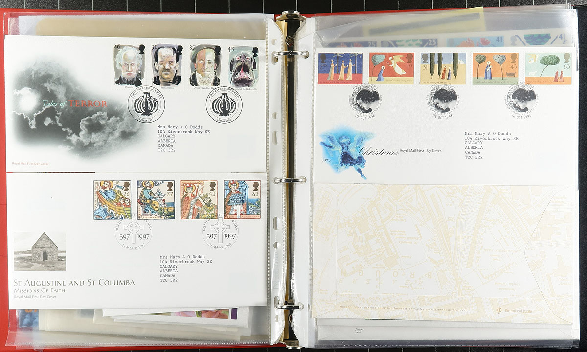 Nice group of roughly 325 first day covers, 1978-2008, in 2 binders with roughly 200 loose covers. We note primarily set frankings, along with souvenir sheets, Machin (including Regionals), and high denomination frankings, with the majority of material post 1996. Concise catalogue value for the lot would be worth several hundred pounds, making this a nice lot for collectors and dealers alike. A few corner bends on a few covers, still a very fine lot. Estimate =