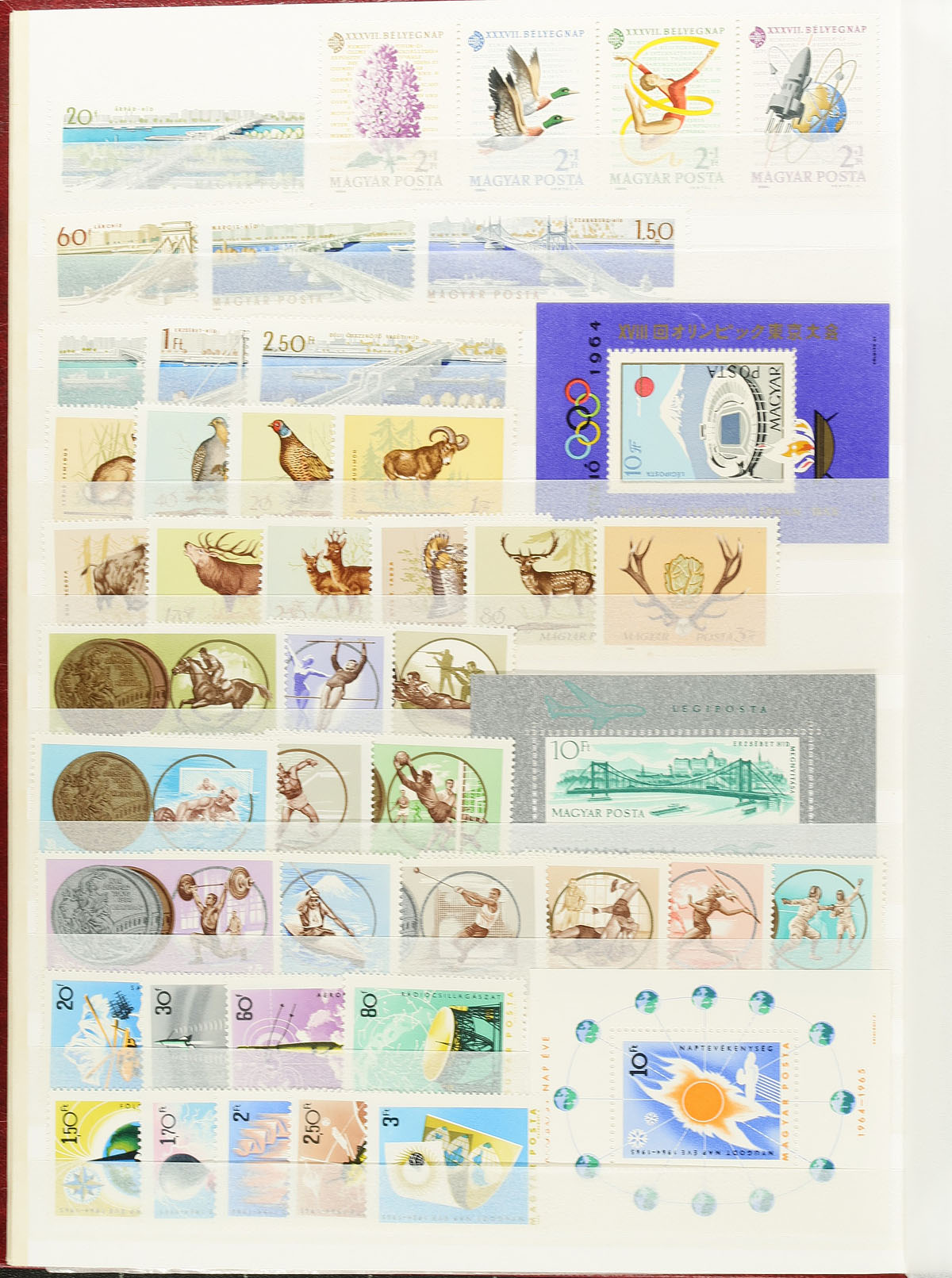 Clean collection of never hinged Hungary, 1939-1990, containing a few thousand stamps in 2 stockbooks. This well organized collection ranges from Scott #537/3240, containing primarily sets, along with souvenir sheets, airmail, semi-postals, and other back of the book material. A spot check indicated several sets cataloguing in the $3 to $5 range, with no visible duplication throughout the collection. A great lot for topical and thematic collectors as we encountered several suitable subjects including Olympics, flowers, birds, space and travel, paintings, and much more. Clean and very fine. Estimate =
