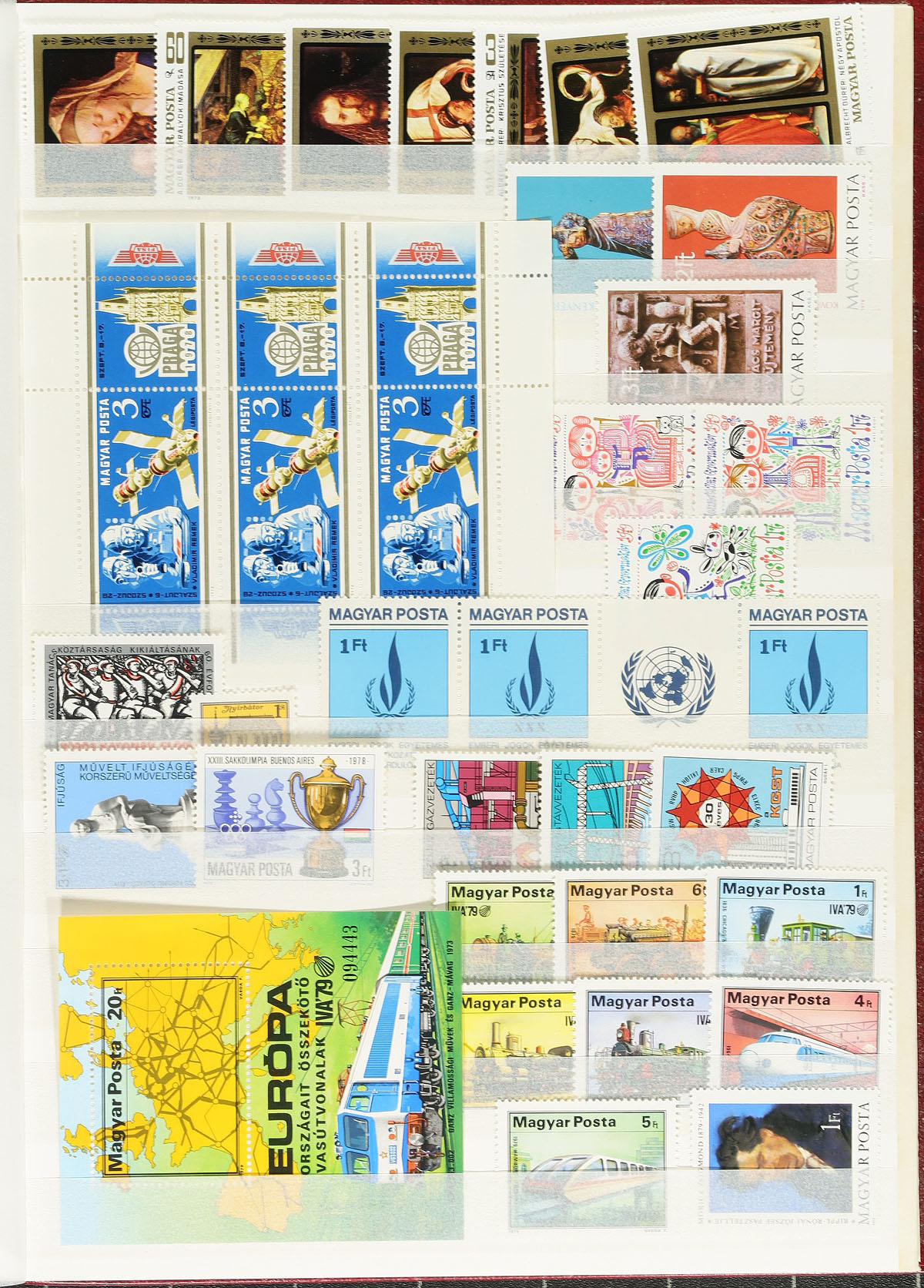 Clean collection of never hinged Hungary, 1939-1990, containing a few thousand stamps in 2 stockbooks. This well organized collection ranges from Scott #537/3240, containing primarily sets, along with souvenir sheets, airmail, semi-postals, and other back of the book material. A spot check indicated several sets cataloguing in the $3 to $5 range, with no visible duplication throughout the collection. A great lot for topical and thematic collectors as we encountered several suitable subjects including Olympics, flowers, birds, space and travel, paintings, and much more. Clean and very fine. Estimate =