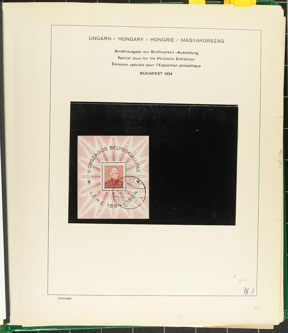 Group of roughly 65 primarily used Hungary souvenir sheets, 1934-1970, neatly arranged on album pages housed in a springback album. The collection ranges from Scott #486/2030, along with selection of airmails, semi-postals, and semi-postal airmails, noting just a few of the better sheets with #s 486 (used, c.v. $105), CB1D (used, $100), CB2 (used, $100), along with a few sheets cataloguing $15 to $30 and up. A nice lot for collectors and dealers alike. 2026 Scott US$933.00 =