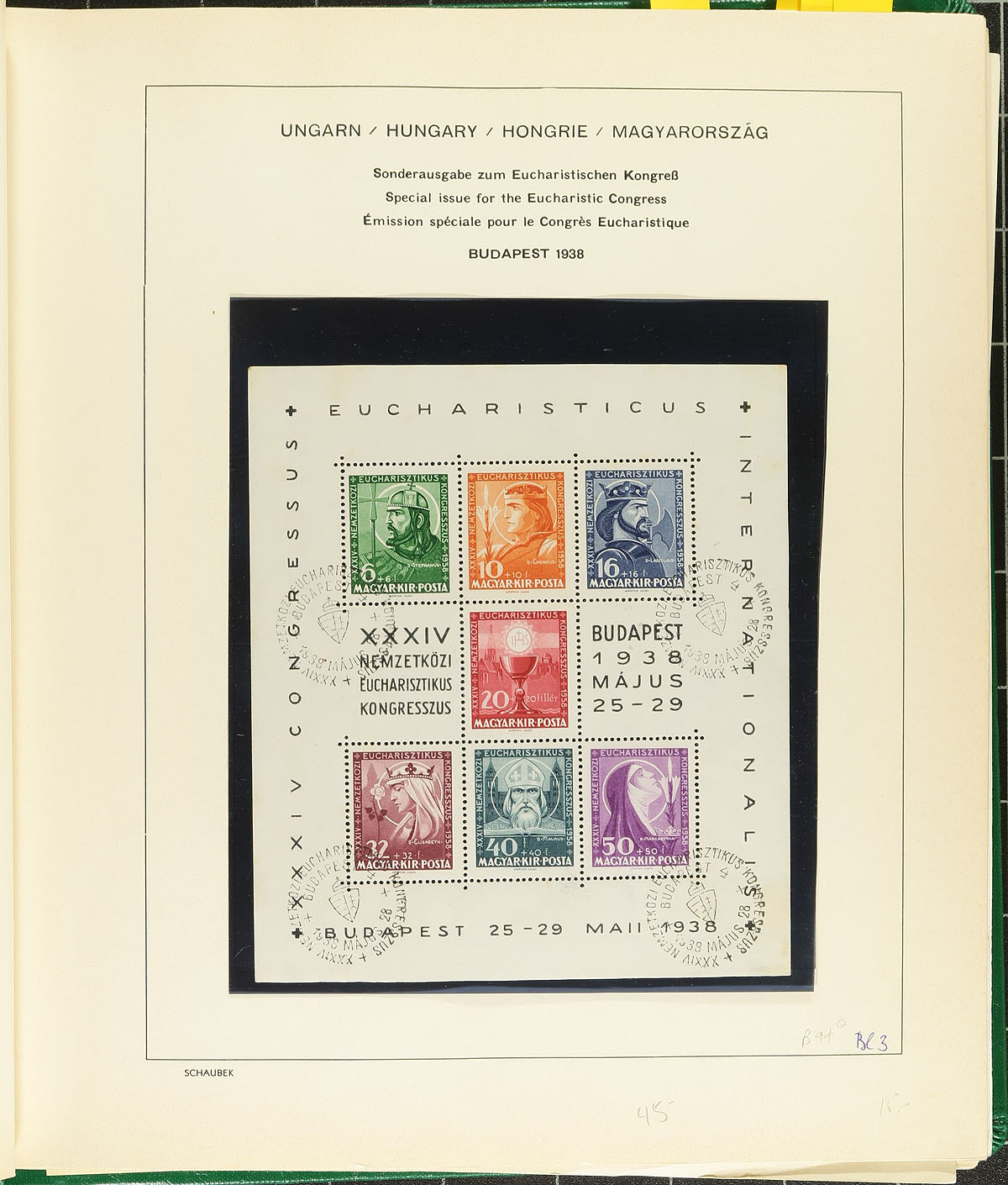 Group of roughly 65 primarily used Hungary souvenir sheets, 1934-1970, neatly arranged on album pages housed in a springback album. The collection ranges from Scott #486/2030, along with selection of airmails, semi-postals, and semi-postal airmails, noting just a few of the better sheets with #s 486 (used, c.v. $105), CB1D (used, $100), CB2 (used, $100), along with a few sheets cataloguing $15 to $30 and up. A nice lot for collectors and dealers alike. 2026 Scott US$933.00 =