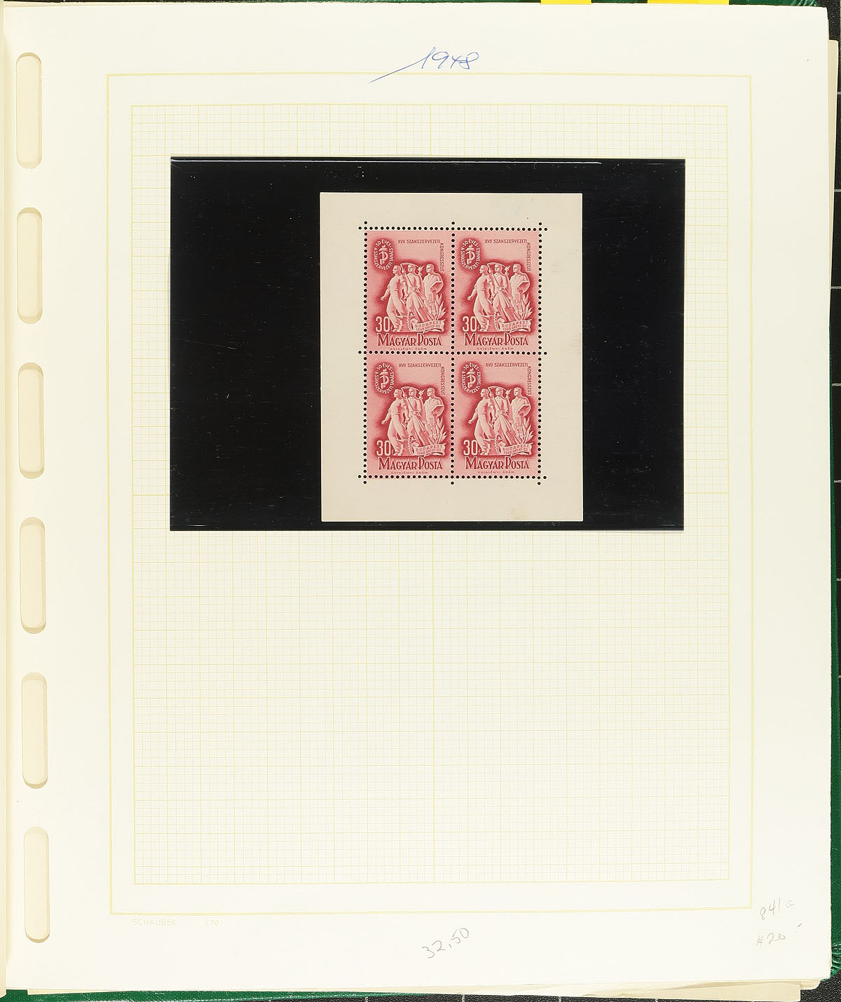 Group of roughly 65 primarily used Hungary souvenir sheets, 1934-1970, neatly arranged on album pages housed in a springback album. The collection ranges from Scott #486/2030, along with selection of airmails, semi-postals, and semi-postal airmails, noting just a few of the better sheets with #s 486 (used, c.v. $105), CB1D (used, $100), CB2 (used, $100), along with a few sheets cataloguing $15 to $30 and up. A nice lot for collectors and dealers alike. 2026 Scott US$933.00 =