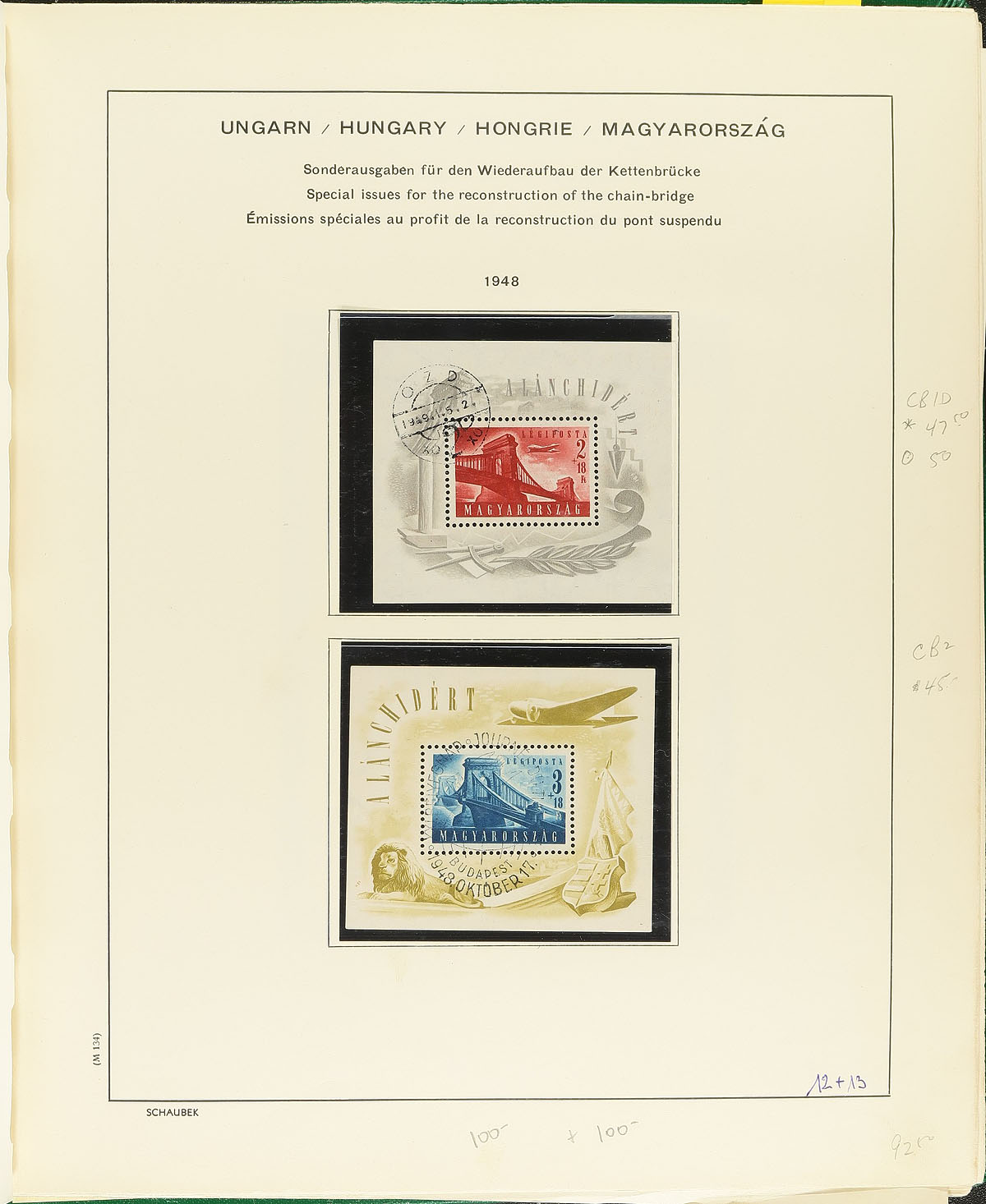 Group of roughly 65 primarily used Hungary souvenir sheets, 1934-1970, neatly arranged on album pages housed in a springback album. The collection ranges from Scott #486/2030, along with selection of airmails, semi-postals, and semi-postal airmails, noting just a few of the better sheets with #s 486 (used, c.v. $105), CB1D (used, $100), CB2 (used, $100), along with a few sheets cataloguing $15 to $30 and up. A nice lot for collectors and dealers alike. 2026 Scott US$933.00 =