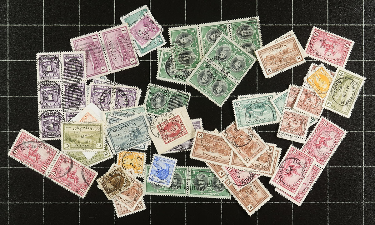 Nice accumulation of a few thousands stamps collected for Canada town postmarks, 1890's-1970's. The lot contains material on and off piece from all the provinces and territories, all neatly organized into individual glassines with a rough breakdown of postmarks from each region: British Columbia (x1,153), Ontario (x186), Manitoba (x116), Territories (x68), Maritimes (x49), Saskatchewan (x42), Quebec (x37), Alberta (x30). The lot also includes a few hundred stamps in a few glassines marked as "unsorted" or for specific postmark types including RPO's (x40), along with proof strikes of Victoria, B.C. Sub #43 (first day of strike) on a facing slip (x20, originally retailing at $50 each), and proof strikes of Victoria-Marigold (last day of strike) on a facing slip (x6, originally retailing at $50 each). Postmarks encountered include cds, split ring, duplex, rpo, MOON, and a few other types, noting many 'socked on the nose' town cancels, including some smaller towns. A lovely lot for the postmark collector. Estimate =