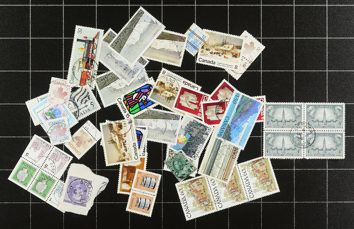 Nice accumulation of a few thousands stamps collected for Canada town postmarks, 1890's-1970's. The lot contains material on and off piece from all the provinces and territories, all neatly organized into individual glassines with a rough breakdown of postmarks from each region: British Columbia (x1,153), Ontario (x186), Manitoba (x116), Territories (x68), Maritimes (x49), Saskatchewan (x42), Quebec (x37), Alberta (x30). The lot also includes a few hundred stamps in a few glassines marked as "unsorted" or for specific postmark types including RPO's (x40), along with proof strikes of Victoria, B.C. Sub #43 (first day of strike) on a facing slip (x20, originally retailing at $50 each), and proof strikes of Victoria-Marigold (last day of strike) on a facing slip (x6, originally retailing at $50 each). Postmarks encountered include cds, split ring, duplex, rpo, MOON, and a few other types, noting many 'socked on the nose' town cancels, including some smaller towns. A lovely lot for the postmark collector. Estimate =