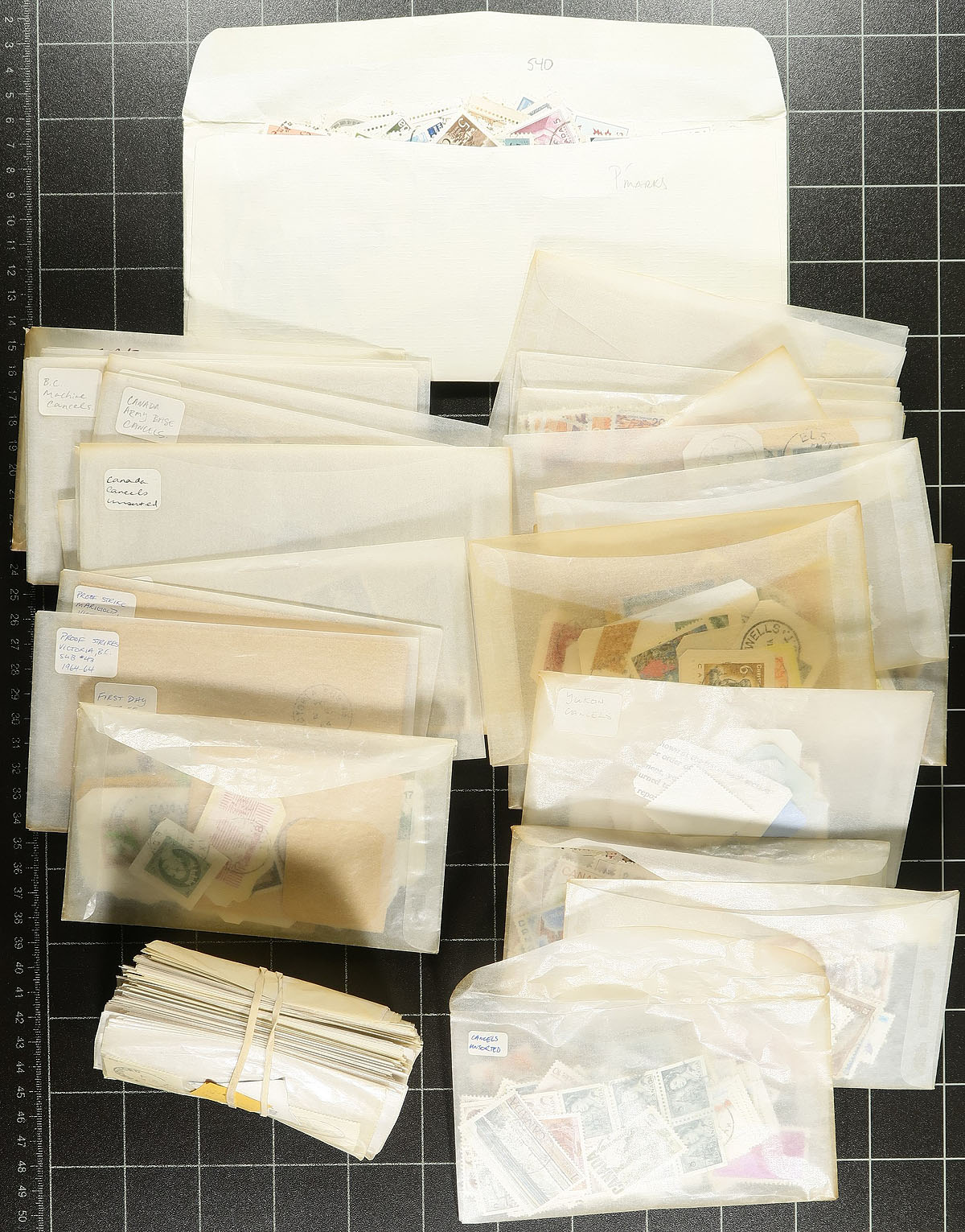 Nice accumulation of a few thousands stamps collected for Canada town postmarks, 1890's-1970's. The lot contains material on and off piece from all the provinces and territories, all neatly organized into individual glassines with a rough breakdown of postmarks from each region: British Columbia (x1,153), Ontario (x186), Manitoba (x116), Territories (x68), Maritimes (x49), Saskatchewan (x42), Quebec (x37), Alberta (x30). The lot also includes a few hundred stamps in a few glassines marked as "unsorted" or for specific postmark types including RPO's (x40), along with proof strikes of Victoria, B.C. Sub #43 (first day of strike) on a facing slip (x20, originally retailing at $50 each), and proof strikes of Victoria-Marigold (last day of strike) on a facing slip (x6, originally retailing at $50 each). Postmarks encountered include cds, split ring, duplex, rpo, MOON, and a few other types, noting many 'socked on the nose' town cancels, including some smaller towns. A lovely lot for the postmark collector. Estimate =