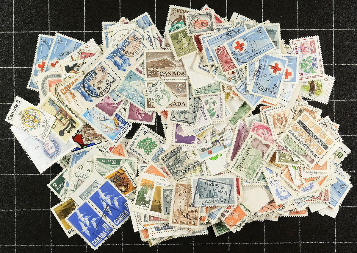 Nice accumulation of a few thousands stamps collected for Canada town postmarks, 1890's-1970's. The lot contains material on and off piece from all the provinces and territories, all neatly organized into individual glassines with a rough breakdown of postmarks from each region: British Columbia (x1,153), Ontario (x186), Manitoba (x116), Territories (x68), Maritimes (x49), Saskatchewan (x42), Quebec (x37), Alberta (x30). The lot also includes a few hundred stamps in a few glassines marked as "unsorted" or for specific postmark types including RPO's (x40), along with proof strikes of Victoria, B.C. Sub #43 (first day of strike) on a facing slip (x20, originally retailing at $50 each), and proof strikes of Victoria-Marigold (last day of strike) on a facing slip (x6, originally retailing at $50 each). Postmarks encountered include cds, split ring, duplex, rpo, MOON, and a few other types, noting many 'socked on the nose' town cancels, including some smaller towns. A lovely lot for the postmark collector. Estimate =