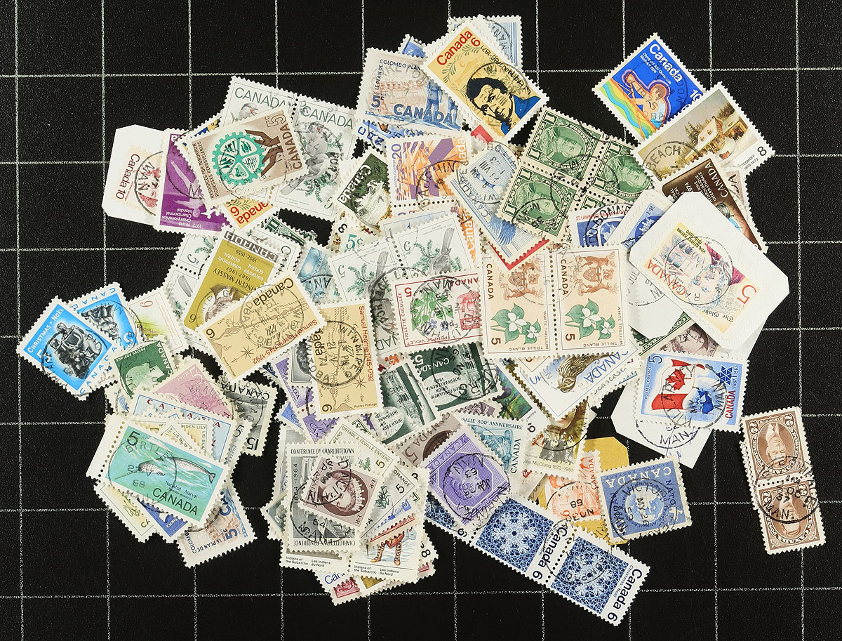 Nice accumulation of a few thousands stamps collected for Canada town postmarks, 1890's-1970's. The lot contains material on and off piece from all the provinces and territories, all neatly organized into individual glassines with a rough breakdown of postmarks from each region: British Columbia (x1,153), Ontario (x186), Manitoba (x116), Territories (x68), Maritimes (x49), Saskatchewan (x42), Quebec (x37), Alberta (x30). The lot also includes a few hundred stamps in a few glassines marked as "unsorted" or for specific postmark types including RPO's (x40), along with proof strikes of Victoria, B.C. Sub #43 (first day of strike) on a facing slip (x20, originally retailing at $50 each), and proof strikes of Victoria-Marigold (last day of strike) on a facing slip (x6, originally retailing at $50 each). Postmarks encountered include cds, split ring, duplex, rpo, MOON, and a few other types, noting many 'socked on the nose' town cancels, including some smaller towns. A lovely lot for the postmark collector. Estimate =