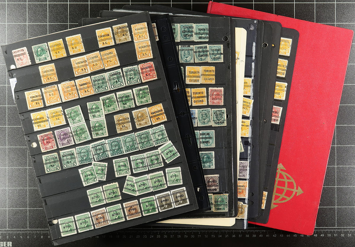Large accumulation of roughly 2,300 precancels, Small Queens up to the 1970's, fairly organized in a stockbook and several stock pages. The lot includes grouped accumulations from Toronto, Montreal, Quebec, and Winnipeg, along with several other cities, noting a variety of bar types, town numbers, varieties (including shifts and inverted town types). The lot includes a variety of individual items cataloguing in the $5 to $20 range each. A lovely lot for the Canada collector or specialist, with all pages shown online. Should be well worth our estimate. Estimate =