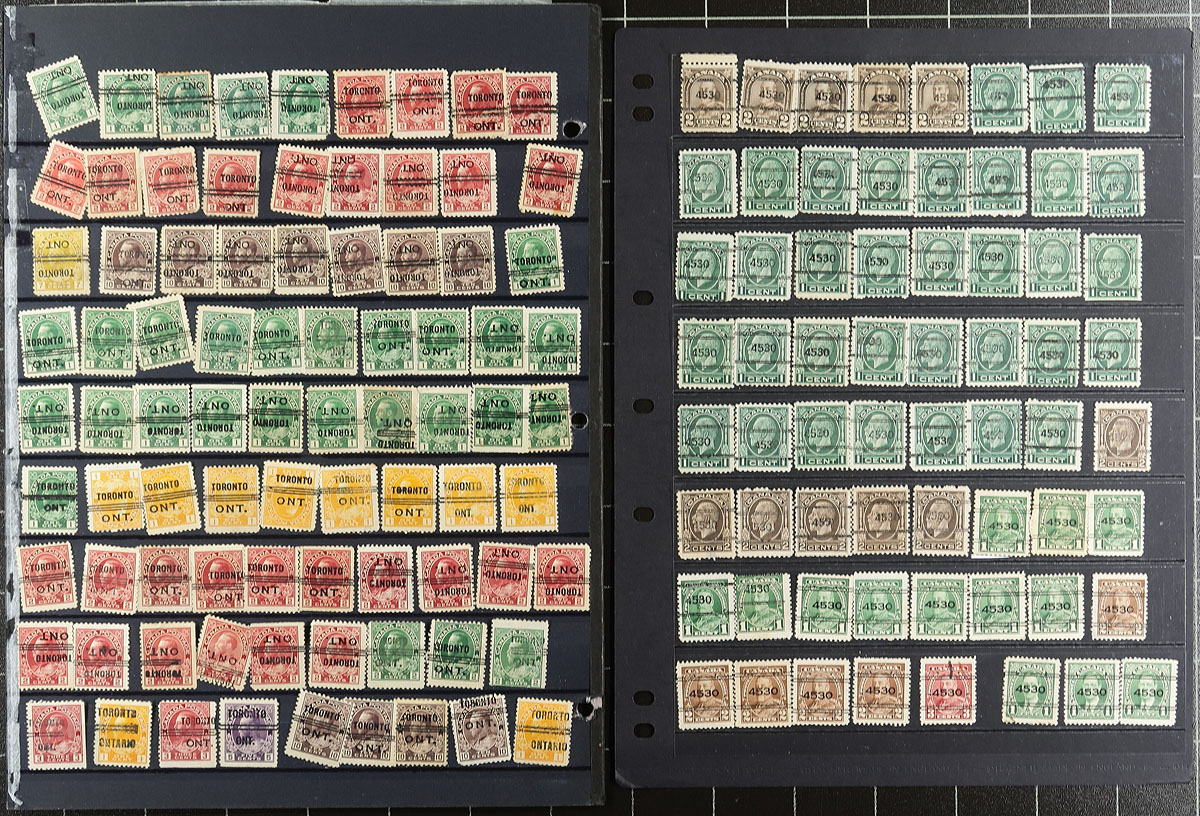 Large accumulation of roughly 2,300 precancels, Small Queens up to the 1970's, fairly organized in a stockbook and several stock pages. The lot includes grouped accumulations from Toronto, Montreal, Quebec, and Winnipeg, along with several other cities, noting a variety of bar types, town numbers, varieties (including shifts and inverted town types). The lot includes a variety of individual items cataloguing in the $5 to $20 range each. A lovely lot for the Canada collector or specialist, with all pages shown online. Should be well worth our estimate. Estimate =