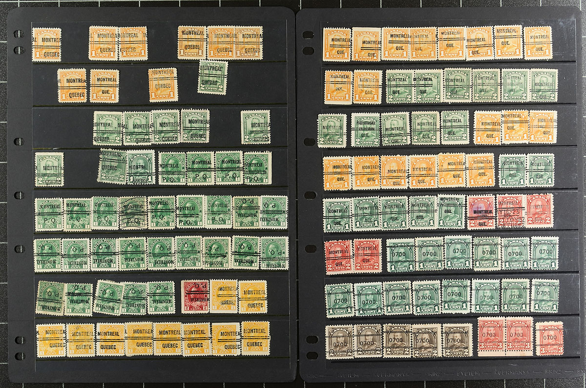 Large accumulation of roughly 2,300 precancels, Small Queens up to the 1970's, fairly organized in a stockbook and several stock pages. The lot includes grouped accumulations from Toronto, Montreal, Quebec, and Winnipeg, along with several other cities, noting a variety of bar types, town numbers, varieties (including shifts and inverted town types). The lot includes a variety of individual items cataloguing in the $5 to $20 range each. A lovely lot for the Canada collector or specialist, with all pages shown online. Should be well worth our estimate. Estimate =