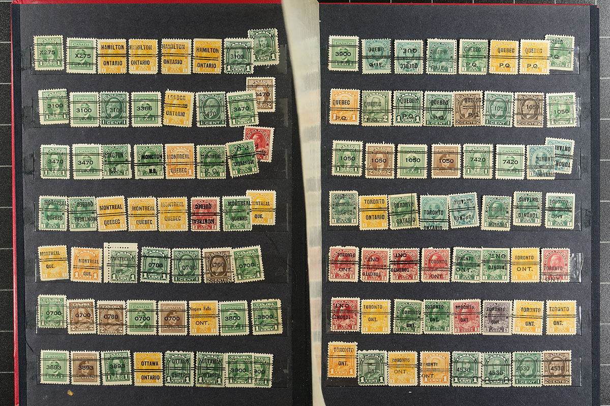 Large accumulation of roughly 2,300 precancels, Small Queens up to the 1970's, fairly organized in a stockbook and several stock pages. The lot includes grouped accumulations from Toronto, Montreal, Quebec, and Winnipeg, along with several other cities, noting a variety of bar types, town numbers, varieties (including shifts and inverted town types). The lot includes a variety of individual items cataloguing in the $5 to $20 range each. A lovely lot for the Canada collector or specialist, with all pages shown online. Should be well worth our estimate. Estimate =