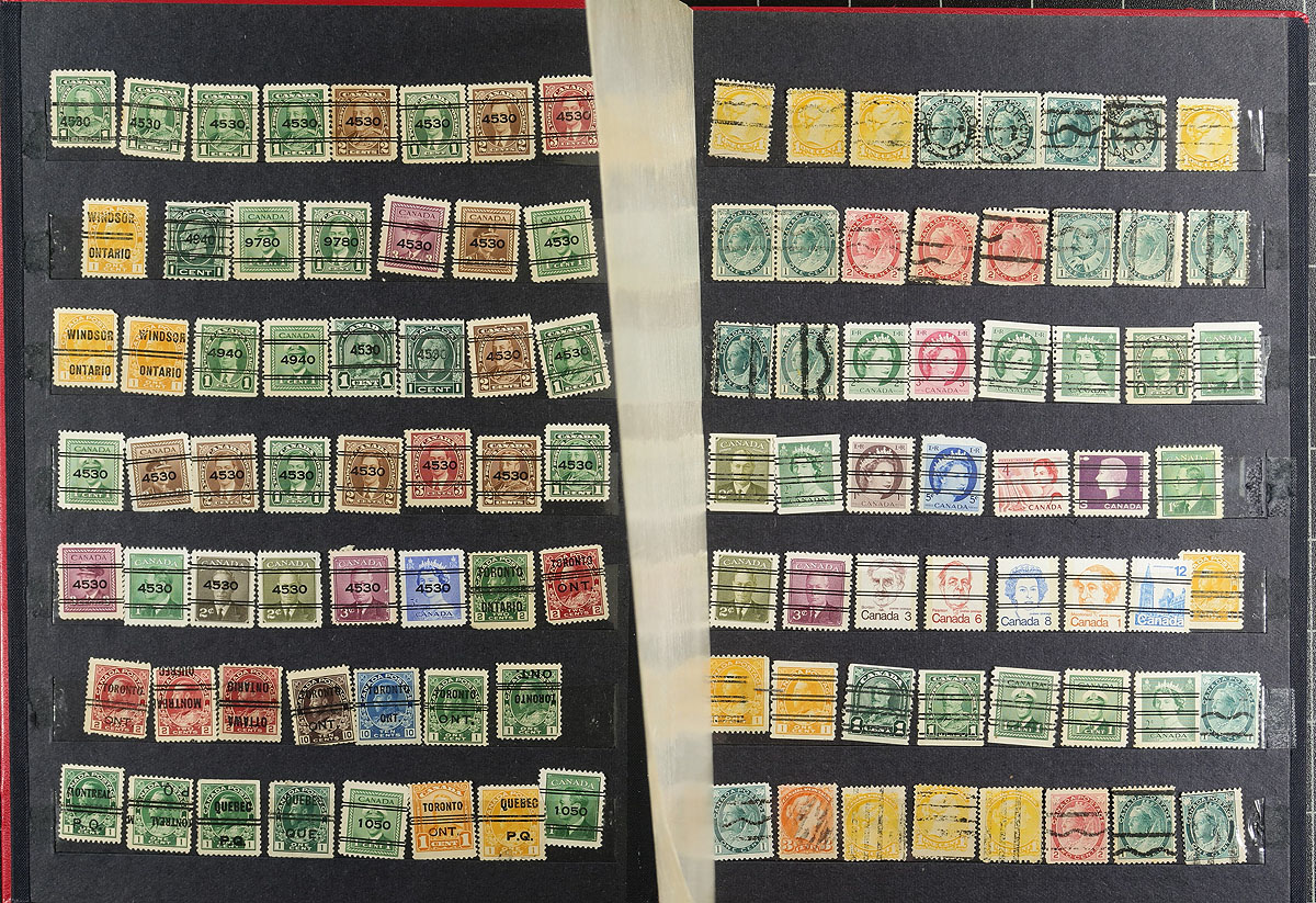 Large accumulation of roughly 2,300 precancels, Small Queens up to the 1970's, fairly organized in a stockbook and several stock pages. The lot includes grouped accumulations from Toronto, Montreal, Quebec, and Winnipeg, along with several other cities, noting a variety of bar types, town numbers, varieties (including shifts and inverted town types). The lot includes a variety of individual items cataloguing in the $5 to $20 range each. A lovely lot for the Canada collector or specialist, with all pages shown online. Should be well worth our estimate. Estimate =