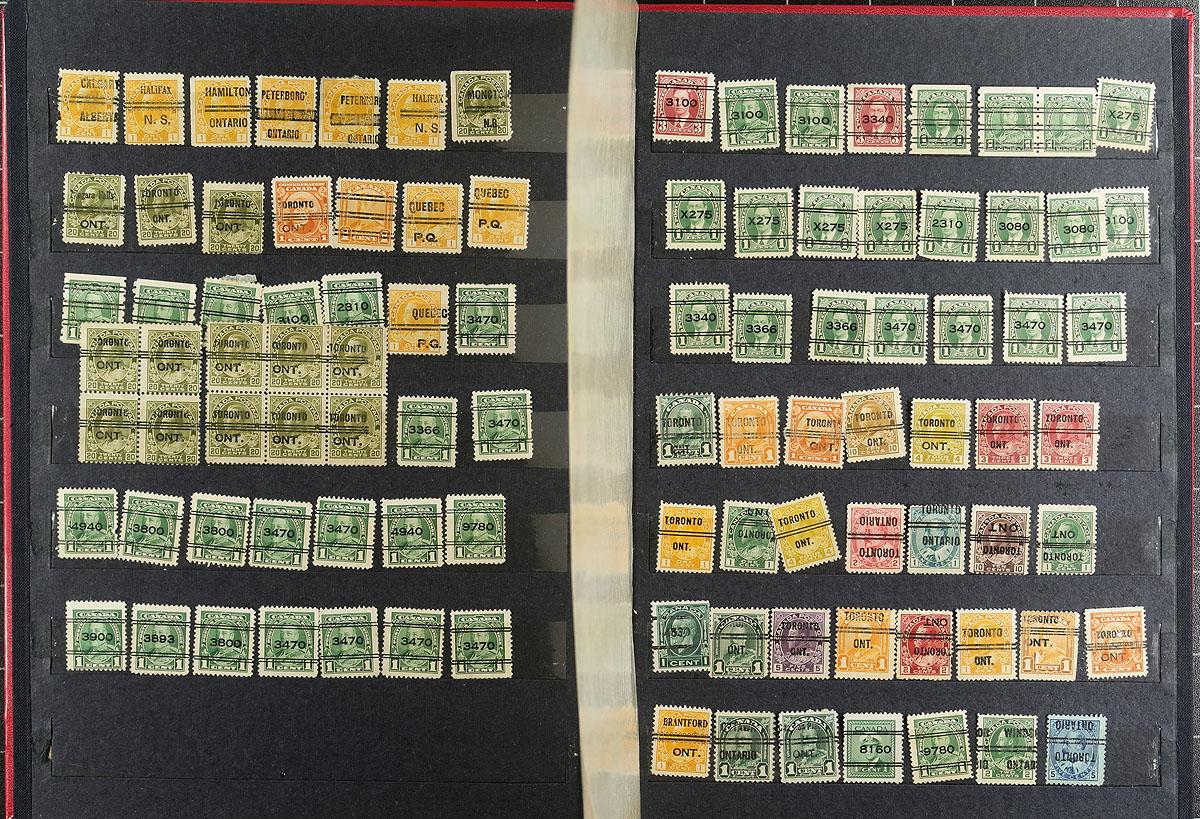 Large accumulation of roughly 2,300 precancels, Small Queens up to the 1970's, fairly organized in a stockbook and several stock pages. The lot includes grouped accumulations from Toronto, Montreal, Quebec, and Winnipeg, along with several other cities, noting a variety of bar types, town numbers, varieties (including shifts and inverted town types). The lot includes a variety of individual items cataloguing in the $5 to $20 range each. A lovely lot for the Canada collector or specialist, with all pages shown online. Should be well worth our estimate. Estimate =