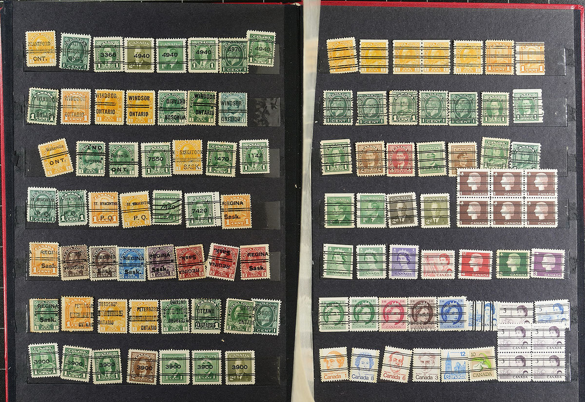Large accumulation of roughly 2,300 precancels, Small Queens up to the 1970's, fairly organized in a stockbook and several stock pages. The lot includes grouped accumulations from Toronto, Montreal, Quebec, and Winnipeg, along with several other cities, noting a variety of bar types, town numbers, varieties (including shifts and inverted town types). The lot includes a variety of individual items cataloguing in the $5 to $20 range each. A lovely lot for the Canada collector or specialist, with all pages shown online. Should be well worth our estimate. Estimate =