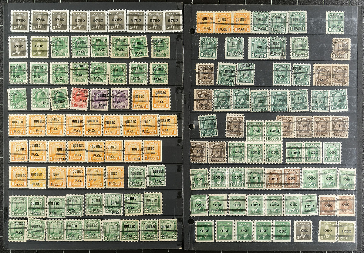 Large accumulation of roughly 2,300 precancels, Small Queens up to the 1970's, fairly organized in a stockbook and several stock pages. The lot includes grouped accumulations from Toronto, Montreal, Quebec, and Winnipeg, along with several other cities, noting a variety of bar types, town numbers, varieties (including shifts and inverted town types). The lot includes a variety of individual items cataloguing in the $5 to $20 range each. A lovely lot for the Canada collector or specialist, with all pages shown online. Should be well worth our estimate. Estimate =
