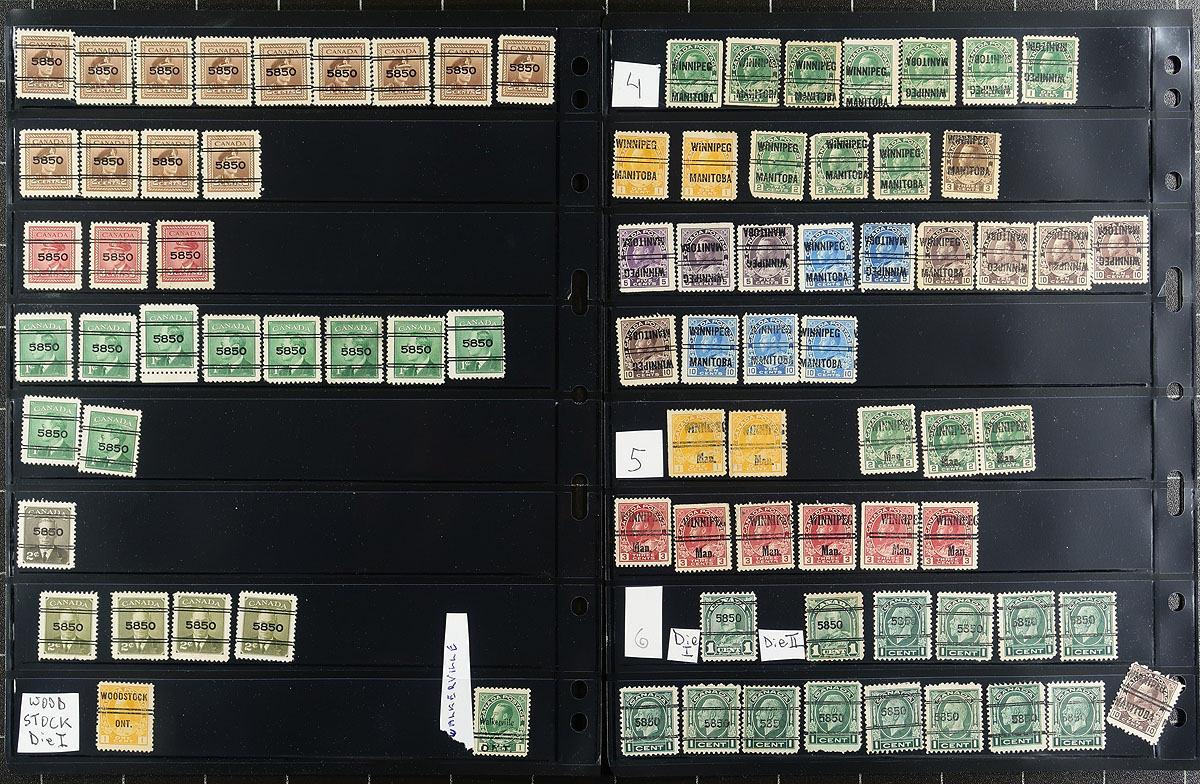 Large accumulation of roughly 2,300 precancels, Small Queens up to the 1970's, fairly organized in a stockbook and several stock pages. The lot includes grouped accumulations from Toronto, Montreal, Quebec, and Winnipeg, along with several other cities, noting a variety of bar types, town numbers, varieties (including shifts and inverted town types). The lot includes a variety of individual items cataloguing in the $5 to $20 range each. A lovely lot for the Canada collector or specialist, with all pages shown online. Should be well worth our estimate. Estimate =