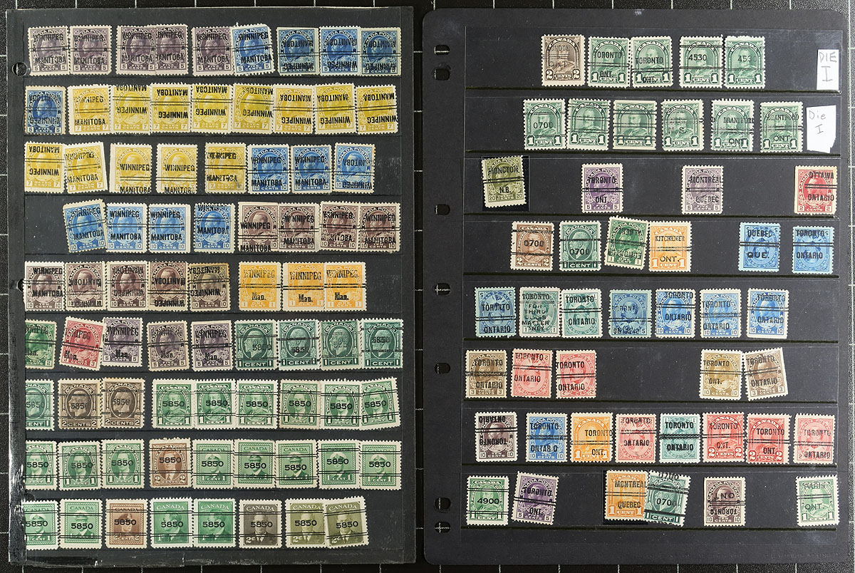 Large accumulation of roughly 2,300 precancels, Small Queens up to the 1970's, fairly organized in a stockbook and several stock pages. The lot includes grouped accumulations from Toronto, Montreal, Quebec, and Winnipeg, along with several other cities, noting a variety of bar types, town numbers, varieties (including shifts and inverted town types). The lot includes a variety of individual items cataloguing in the $5 to $20 range each. A lovely lot for the Canada collector or specialist, with all pages shown online. Should be well worth our estimate. Estimate =