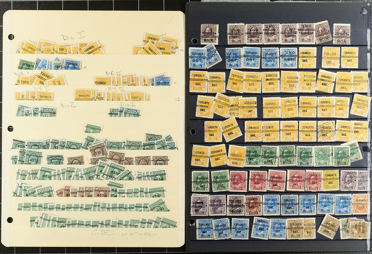 Large accumulation of roughly 2,300 precancels, Small Queens up to the 1970's, fairly organized in a stockbook and several stock pages. The lot includes grouped accumulations from Toronto, Montreal, Quebec, and Winnipeg, along with several other cities, noting a variety of bar types, town numbers, varieties (including shifts and inverted town types). The lot includes a variety of individual items cataloguing in the $5 to $20 range each. A lovely lot for the Canada collector or specialist, with all pages shown online. Should be well worth our estimate. Estimate =