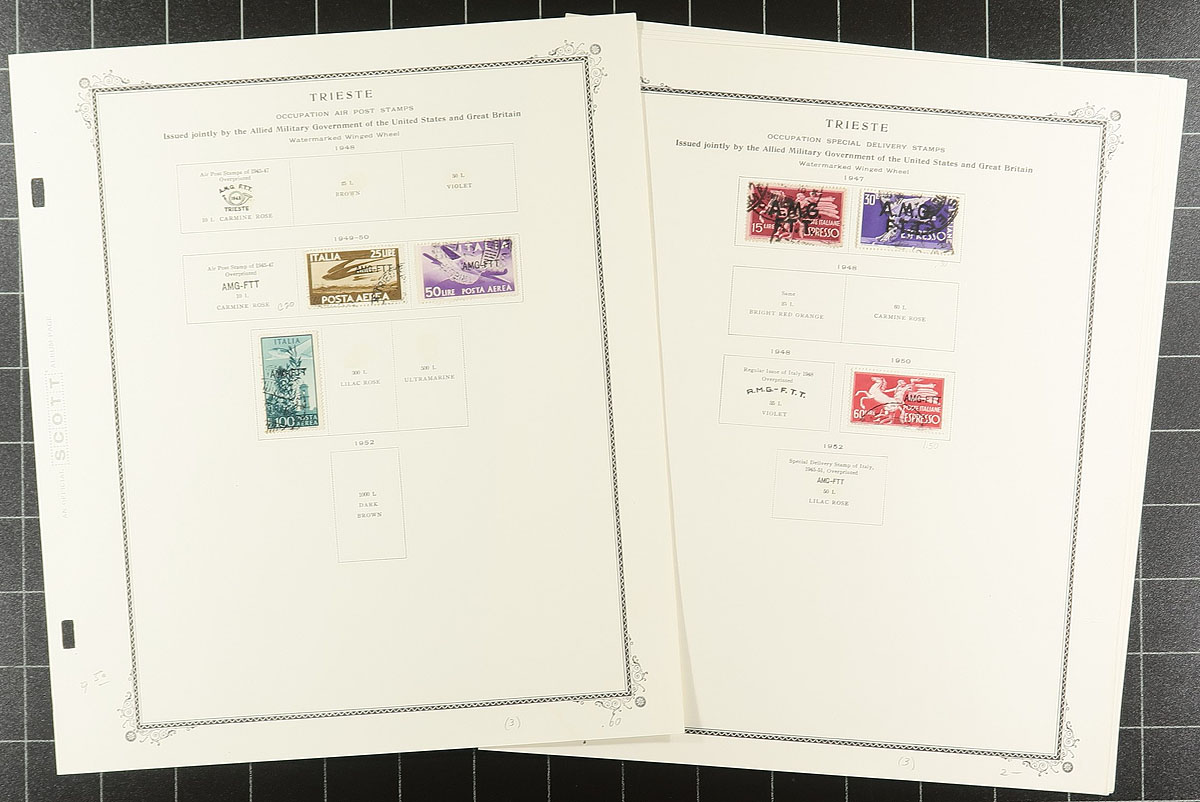 Nice collection / accumulation of mint and used Trieste, 1947-1954, containing roughly 500 stamps in album or stock pages. The bulk of the lot is with the collection of roughly 315 stamps, well organized in several album pages, ranging from Scott #1/208, including airmails, special delivery, postage dues, parcel posts and more. A spot check indicated some singles and sets cataloguing $20 and up including #s 1-17 (used, c.v. $101 total) and more, with mild duplication possible. Owner's Scott 2026 catalogue value for the collection totals $1,676. The lot also includes a few stock pages of Trieste material. A nice lot for the Italy or worldwide collector, overall fine to very fine. 2026 Scott US$1,676.00 =
