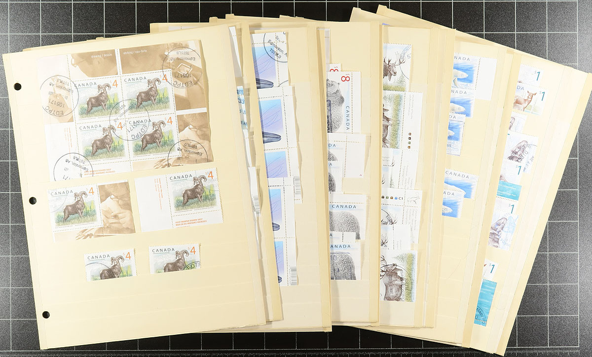 Nice accumulation of used high definitive 'Wildlife' issues, 1998-2018, containing many hundreds of stamps in 12 manila stock pages. The lot contains singles, se-tenant pairs, and a few panes, including Unitrade #s 1687 Loon (x27); 1688-1689 White-tailed Deer and Atlantic Walrus (x25 singles, se-tenant pairs x19); 1690 Polar Bear (x31); 1691-1692 Peregrine Falcon and Sable Island Horse (x8 singles, se-tenant pairs x3, panes x2); 1693 Moose (x36); 1694 Grizzly Bear (singles x64, pane x1); 2405 Blue Whale (singles x21, blocks of 2 x6); 3129 Bighorn Sheep (singles x4, plate block x1). Postmarks appear to be POCON types from Edmonton or British Columbia. Unitrade catalogue value for the lot totals $1,187.35. A lovely lot for used collectors, overall fine to very fine. Estimate =