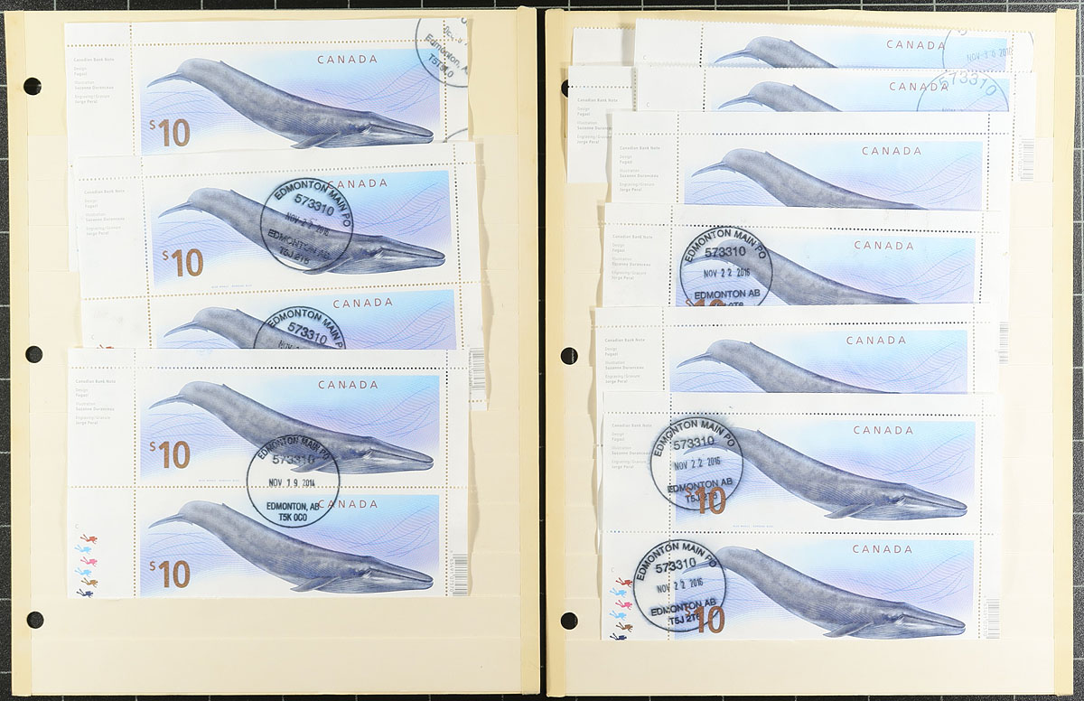 Nice accumulation of used high definitive 'Wildlife' issues, 1998-2018, containing many hundreds of stamps in 12 manila stock pages. The lot contains singles, se-tenant pairs, and a few panes, including Unitrade #s 1687 Loon (x27); 1688-1689 White-tailed Deer and Atlantic Walrus (x25 singles, se-tenant pairs x19); 1690 Polar Bear (x31); 1691-1692 Peregrine Falcon and Sable Island Horse (x8 singles, se-tenant pairs x3, panes x2); 1693 Moose (x36); 1694 Grizzly Bear (singles x64, pane x1); 2405 Blue Whale (singles x21, blocks of 2 x6); 3129 Bighorn Sheep (singles x4, plate block x1). Postmarks appear to be POCON types from Edmonton or British Columbia. Unitrade catalogue value for the lot totals $1,187.35. A lovely lot for used collectors, overall fine to very fine. Estimate =