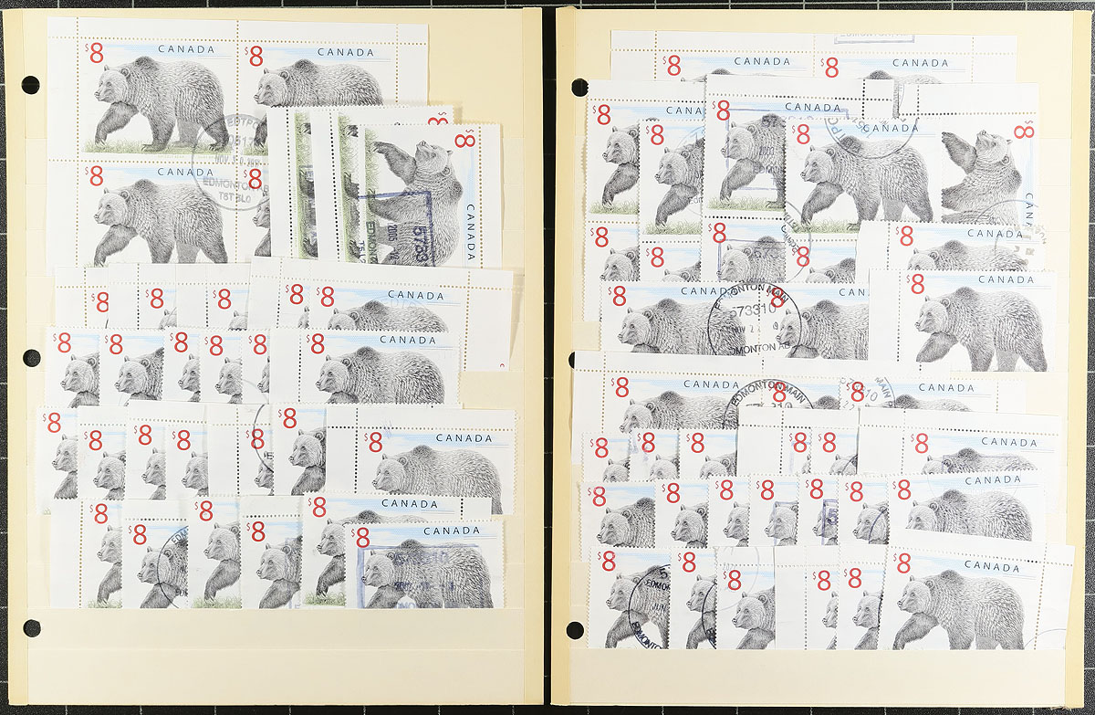 Nice accumulation of used high definitive 'Wildlife' issues, 1998-2018, containing many hundreds of stamps in 12 manila stock pages. The lot contains singles, se-tenant pairs, and a few panes, including Unitrade #s 1687 Loon (x27); 1688-1689 White-tailed Deer and Atlantic Walrus (x25 singles, se-tenant pairs x19); 1690 Polar Bear (x31); 1691-1692 Peregrine Falcon and Sable Island Horse (x8 singles, se-tenant pairs x3, panes x2); 1693 Moose (x36); 1694 Grizzly Bear (singles x64, pane x1); 2405 Blue Whale (singles x21, blocks of 2 x6); 3129 Bighorn Sheep (singles x4, plate block x1). Postmarks appear to be POCON types from Edmonton or British Columbia. Unitrade catalogue value for the lot totals $1,187.35. A lovely lot for used collectors, overall fine to very fine. Estimate =