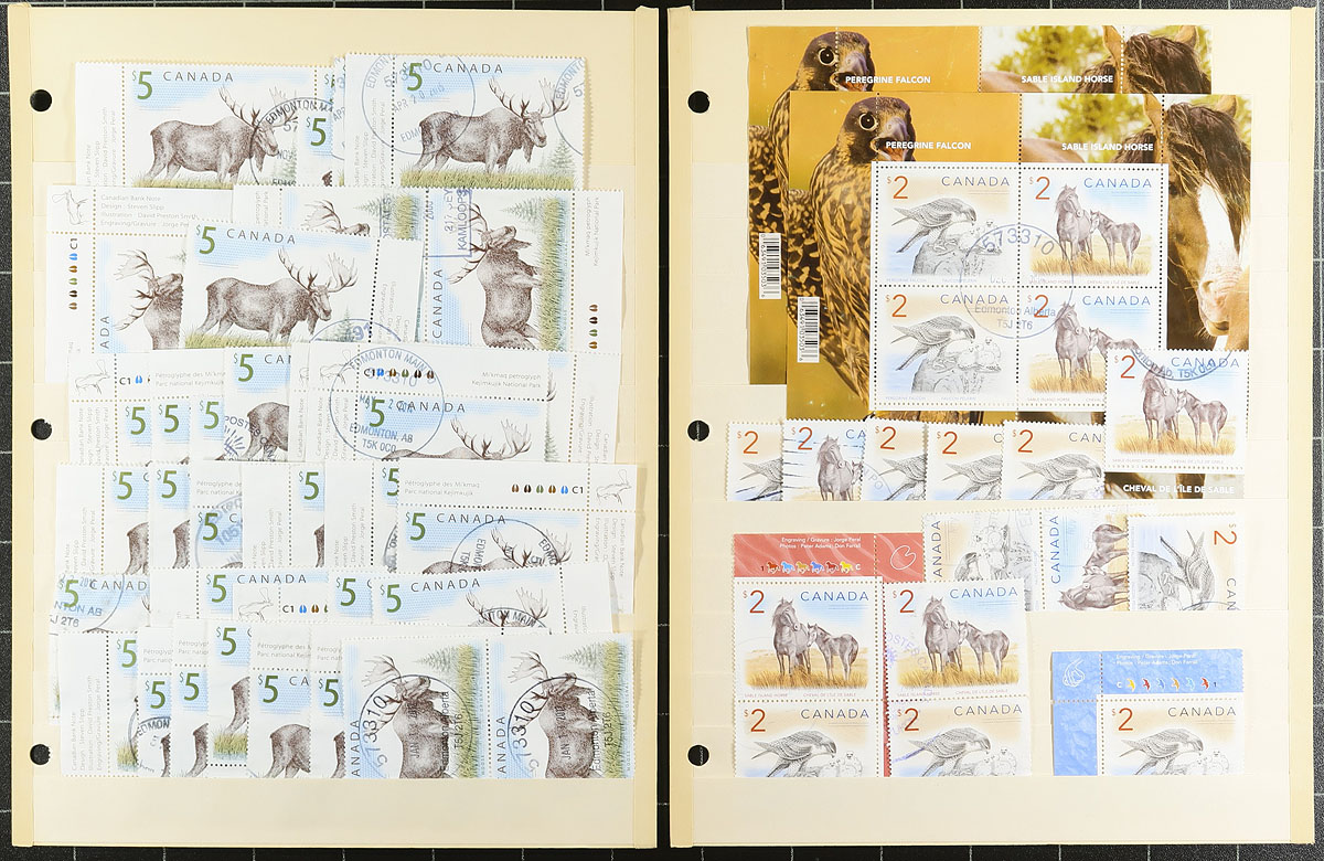 Nice accumulation of used high definitive 'Wildlife' issues, 1998-2018, containing many hundreds of stamps in 12 manila stock pages. The lot contains singles, se-tenant pairs, and a few panes, including Unitrade #s 1687 Loon (x27); 1688-1689 White-tailed Deer and Atlantic Walrus (x25 singles, se-tenant pairs x19); 1690 Polar Bear (x31); 1691-1692 Peregrine Falcon and Sable Island Horse (x8 singles, se-tenant pairs x3, panes x2); 1693 Moose (x36); 1694 Grizzly Bear (singles x64, pane x1); 2405 Blue Whale (singles x21, blocks of 2 x6); 3129 Bighorn Sheep (singles x4, plate block x1). Postmarks appear to be POCON types from Edmonton or British Columbia. Unitrade catalogue value for the lot totals $1,187.35. A lovely lot for used collectors, overall fine to very fine. Estimate =
